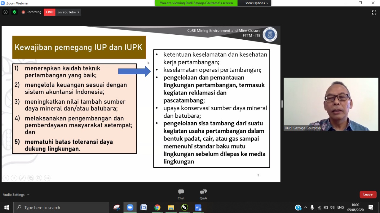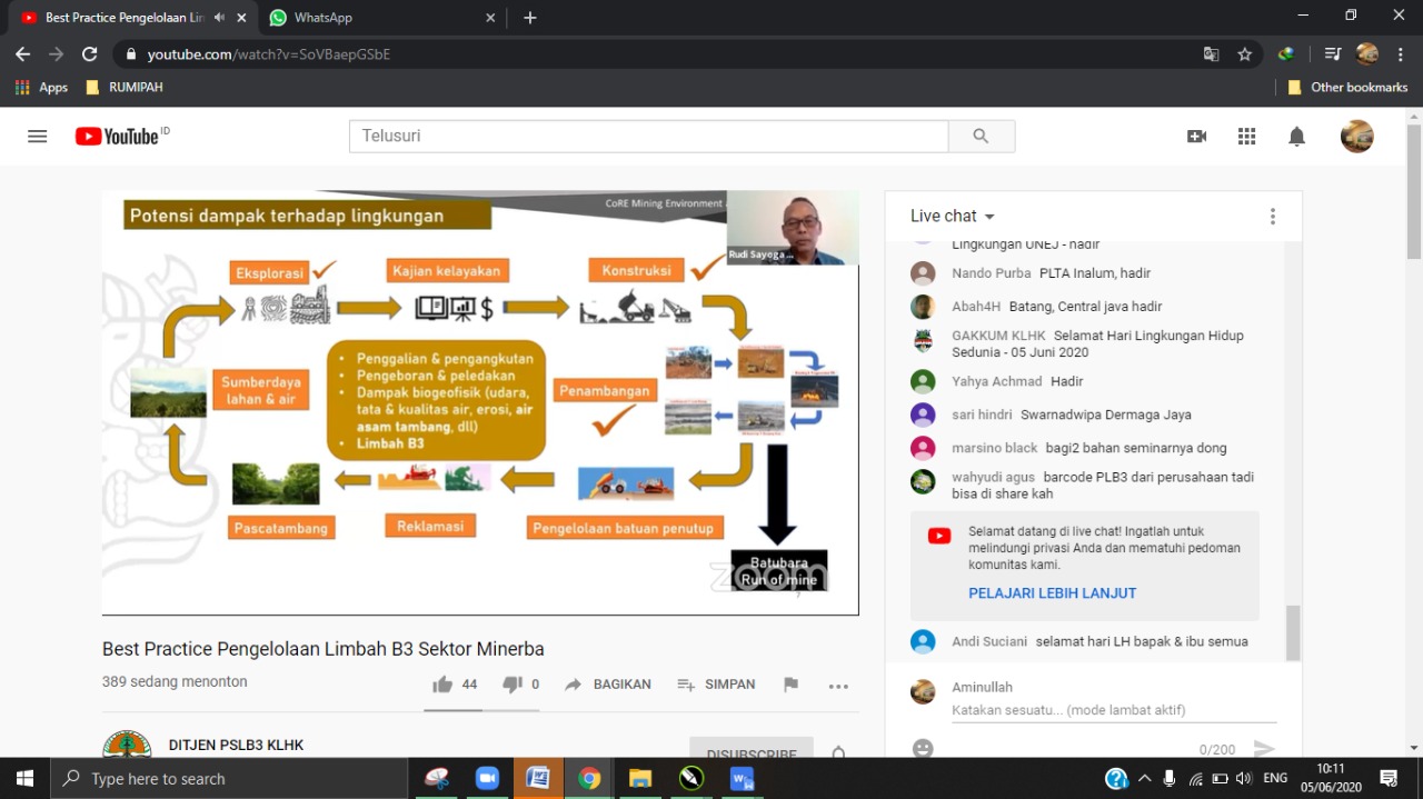 Direktorat Jenderal Pengelolaan Sampah, Limbah, dan Bahan Beracun Berbahaya (PSLB3), pada Jum'at pagi (5/6/2020) mengadakan Seminar secara virtual (webinar) terkait pengelolaan limbah bahan beracun dan berbahaya (B3) di industri pertambangan. Melalui webinar ini diharapkan dapat menggugah, menginsipirasi, meningkatkan komitmen seluruh pihak untuk terus menyelaraskan pembangunan pertambangan dan pelestarian lingkungan hidup.
