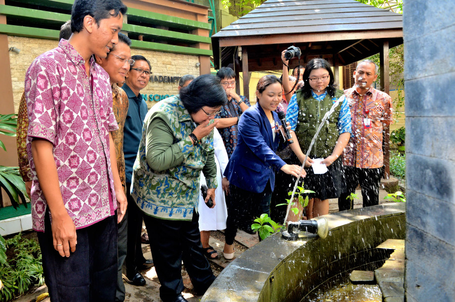 Foto 2 : Menteri LHK Siti Nurbaya meminum air hasil olahan limbah yang ada di SMK Katolik Mater Amabilis Surabaya, Kamis (20/11). Inovasi zero waste water system menjadi unggulan sekolah tersebut dalam pengelolaan lingkungan hidup.