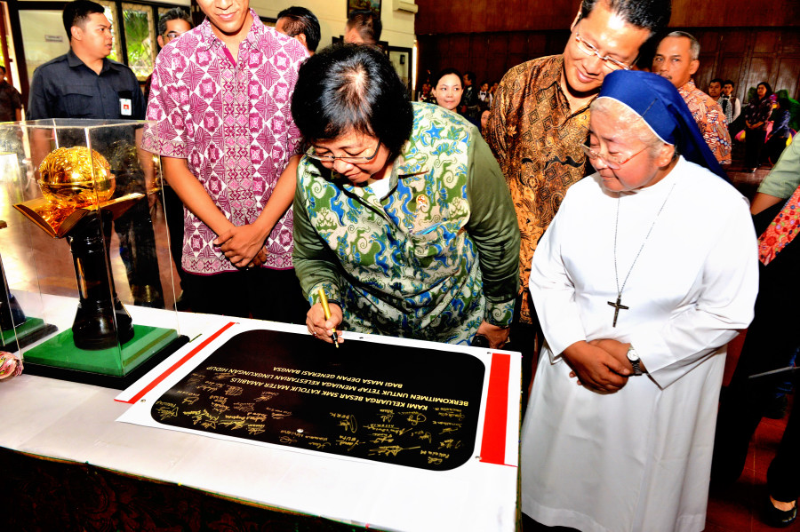 Foto 3 : Menteri LHK Siti Nurbaya membubuhkan tanda tangan pada plakat SMK Katolik Mater Amabilis Surabaya dalam komitmen menjaga kelestarian lingkungan hidup bagi masa depan generasi bangsa.