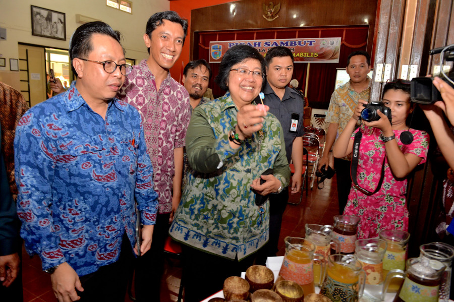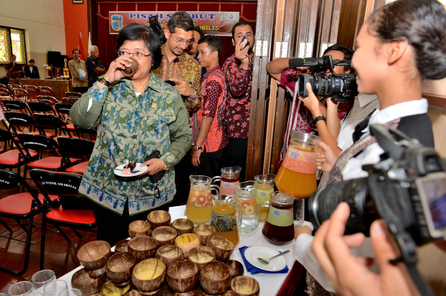 Foto 4 - 5 : Menteri LHK Siti Nurbaya menyempatkan diri mencicipi minuman dan makanan yang dibuat oleh jurusan Jasa Boga SMK Katolik Mater Amabilis Surabaya, Kamis (20/11)