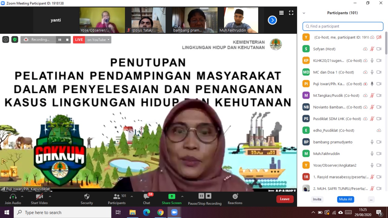 Sekretaris Ditjen Gakkum KLHK, Sugeng Priyanto dalam penutupan pelatihan menyatakan bahwa pihaknya senang bisa menyelesaikan pelatihan ini. Sugeng mengharapkan 98 pendamping masyarakat bekerja sama erat dengan Balai Gakkum KLHK dan dapat memahami arti pentingnya penegakan hukum terhadap pengelolaan LHK. Peserta juga diharapkan dapat segera mempraktikkan pengetahuan dan keterampilan dalam penanganan dan penyelesaian kasus-kasus LHK di daerahnya sesuai dengan ketentuan hukum dan peraturan perundangan yang berlaku.