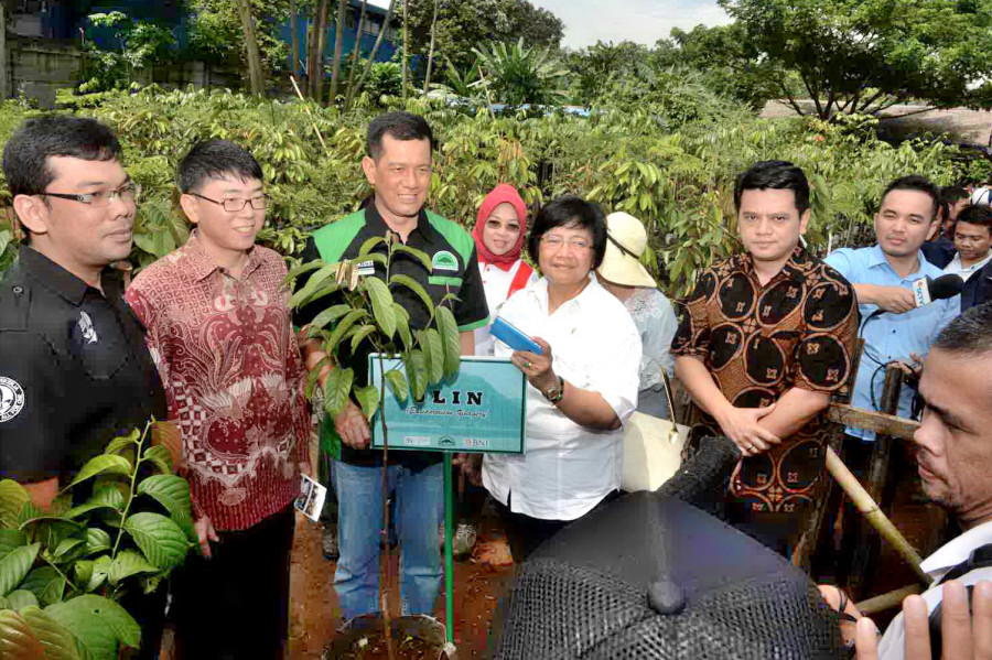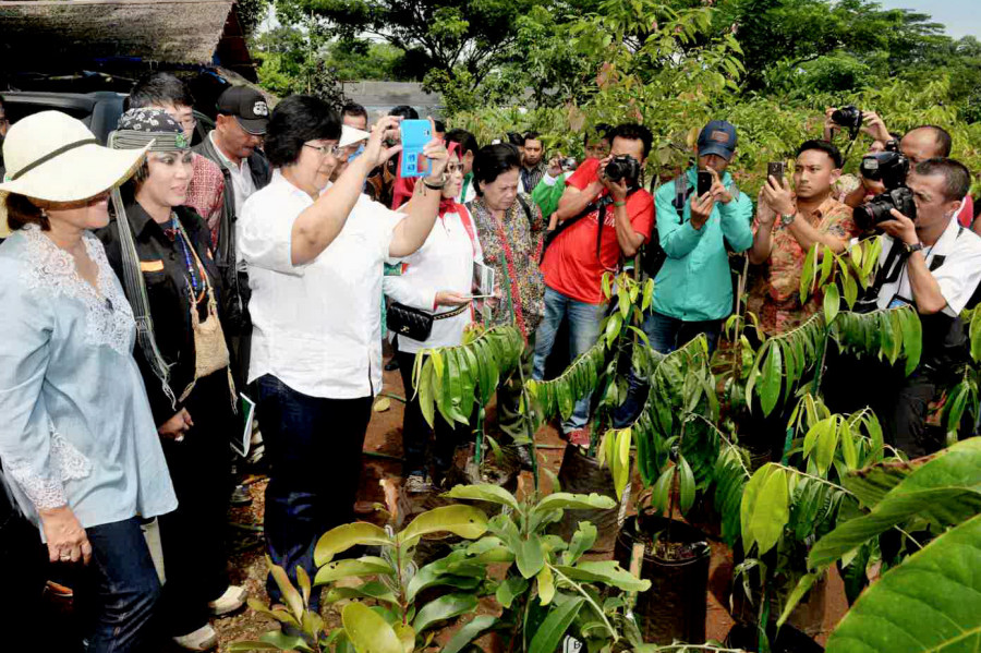 Foto 4. : Menteri Lingkungan Hidup dan Kehutanan Siti Nurbaya didampingi seniman pencinta lingkungan Ully Rusadi, Sylviana Murni Walikota Jakarta Pusat dan Erna Witoelar meninjau bibit pohon sekaligus mengabadikan/memfoto bibit pohon dengan gadget.