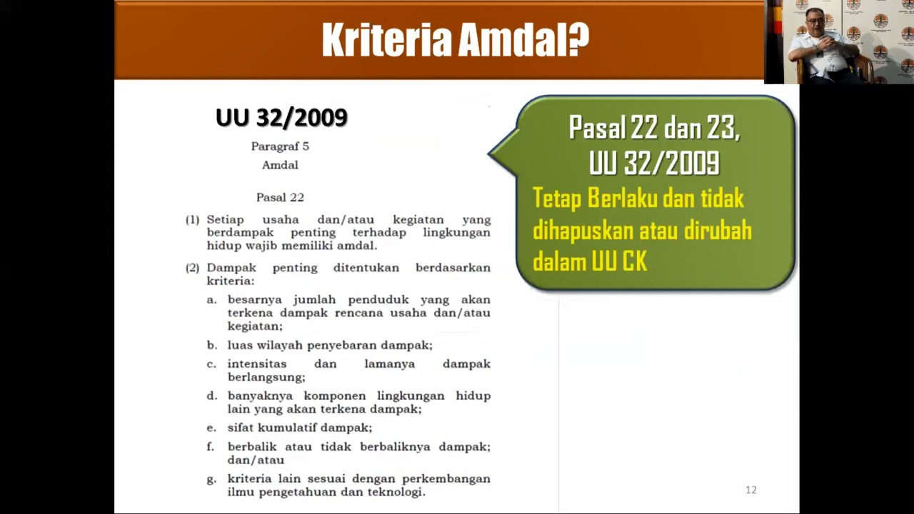 Disahkan Undang-Undang Cipta Kerja (UUCK) pada 5 Oktober 2020 memunculkan beragam tafsir di masyarakat terkait pengaturan terhadap perlindungan dan pengelolaan lingkungan hidup. Kementerian Lingkungan Hidup dan Kehutanan (KLHK) menjawab berbagai multi tafsir tersebut dalam Bincang Undang-Undang secara virtual dengan tema "AMDAL untuk Perlindungan Lingkungan", di Jakarta (14/10).