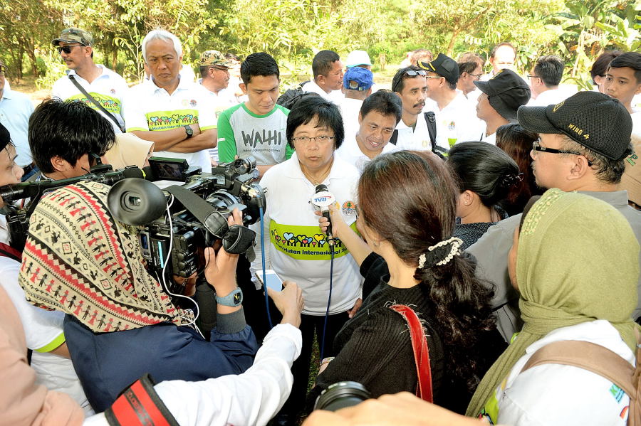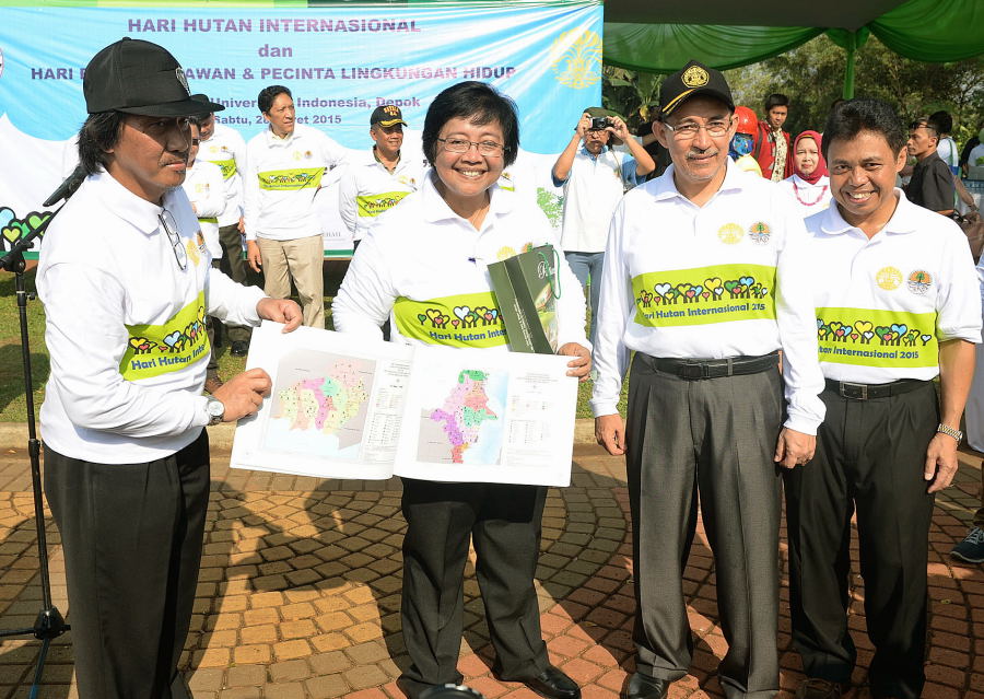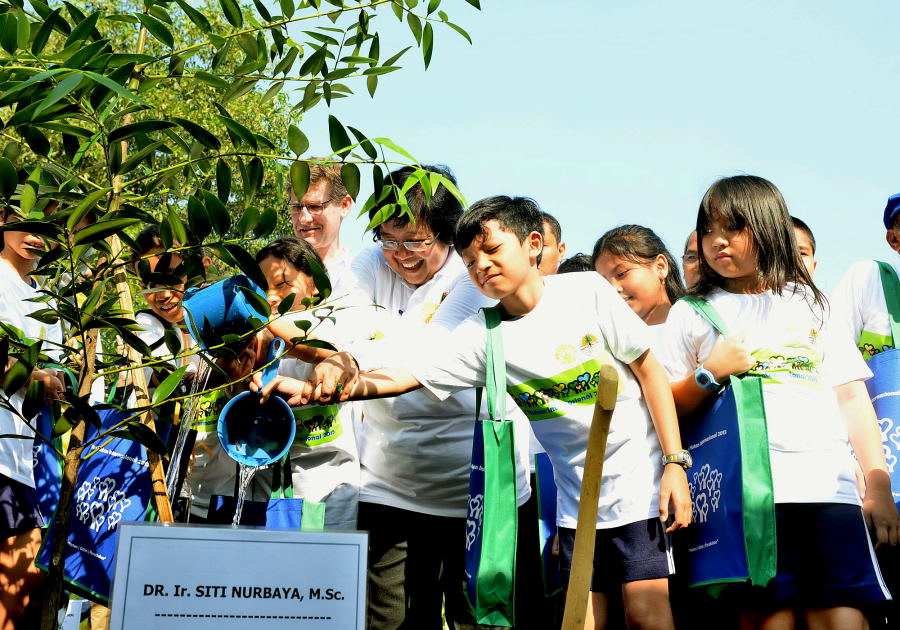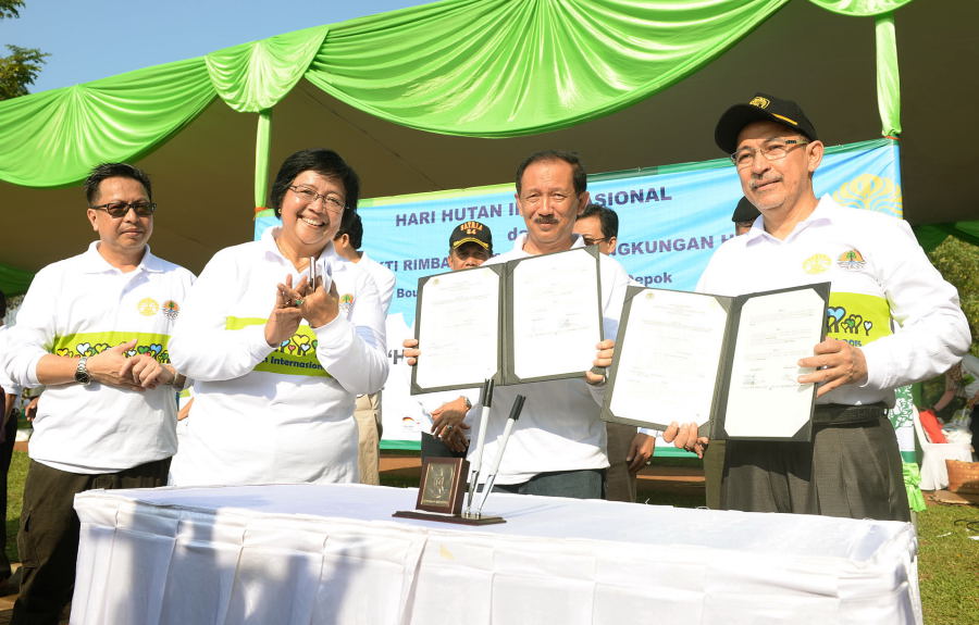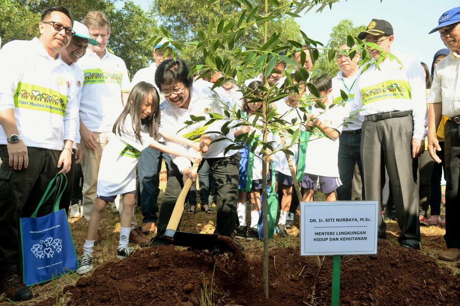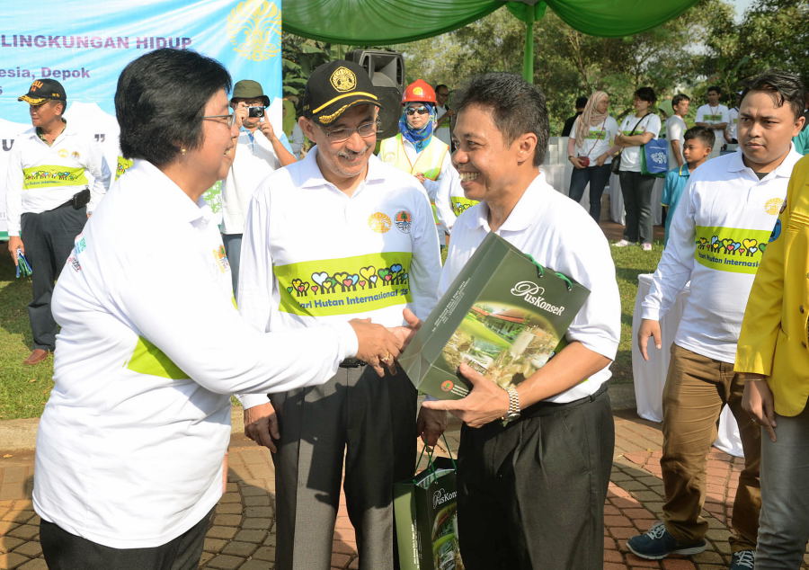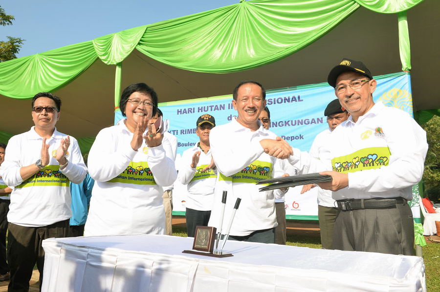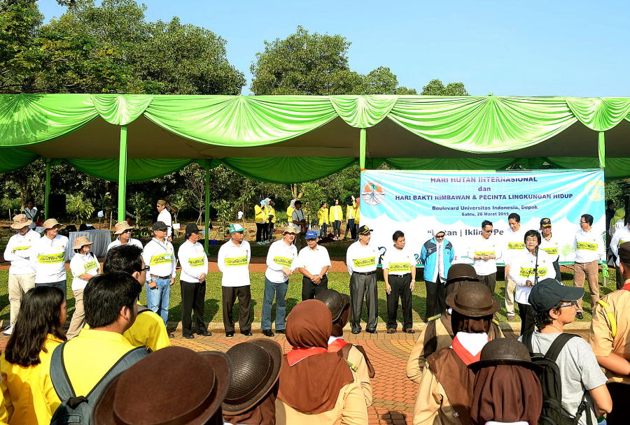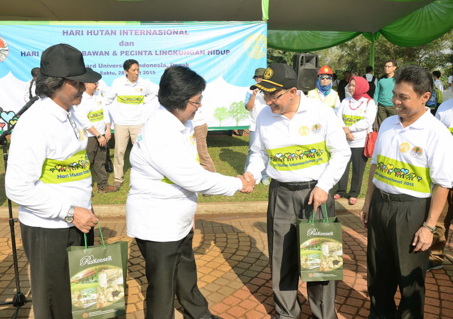 Pushumas Kemenhut, UI Depok : Menteri Lingkungan Hidup dan Kehutanan RI Siti Nurbaya, bersama Rektor Universitas Indonesia (UI) Prof.Dr.Ir.Muhammad Anis, M.Met, hadir memperingati Puncak Perayaan Hari Hutan Internasional 2015, Sabtu (28/3) di Boulevard Universitas Indonesia-Depok Jawa Barat. Kegiatan ini juga dihadiri oleh FAO Country Representative, Walikota Depok, Direktur Utama Garuda Indonesia, Direktur Eksekutif Yayasan KEHATI, Para Aktivis Sosial dan Kemasyarakatan, 700 siswa SD, serta Civitas Akademika UI.