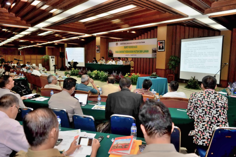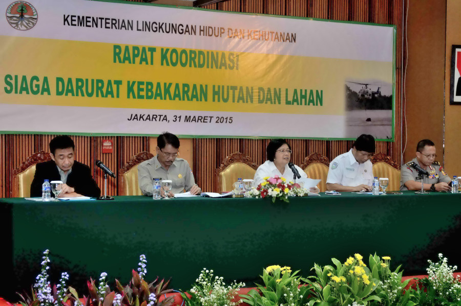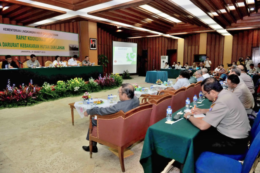 Pushumas Kemenhut, Jakarta : Menteri Koordinator Bidang Politik, Hukum dan Keamanan Republik Indonesia Tedjo Edhy membuka Rapat Koordinasi Siaga Darurat Kebakaran Hutan dan Lahan, Selasa (31/3) di Ruang Rimbawan I Gedung Pusat Kehutanan Manggala Wanabakti, Jakarta. Acara dilanjutkan dengan diskusi panel tentang upaya dan rencana aksi penanganan kebakaran hutan dan lahan tahun 2015 yang dipimpin oleh Menteri Lingkungan Hidup dan Kehutanan Siti Nurbaya. Turut hadir sebagai narasumber kepala daerah yang wilayahnya termasuk rawan kebakaran hutan dan lahan (karhutla) yaitu Provinsi Sumatera Selatan, Provinsi Riau, Provinsi Jambi, Provinsi Kalimantan Tengah dan Provinsi Kalimantan Barat, Badan Nasional Penanggulangan Bencana (BNPB), Badan Meteorologi, Klimatologi dan Geofisika (BMKG), Kementerian Pertanian, serta Kepolisian Republik Indonesia.