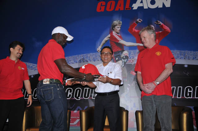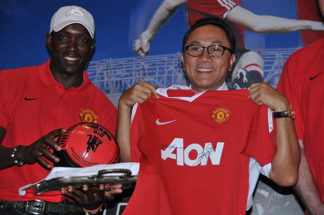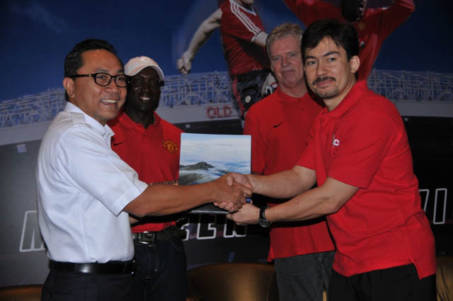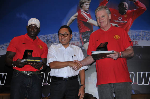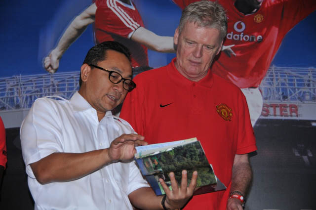 Menteri Kehutanan Zulkifli Hasan (tengah) menerima kaos Manchester United dari legenda pesepak bola Manchester United Dwight Yorke (kiri) dan legenda pesepak bola Manchester United Gordon McQueen di Jakarta, Kamis (29/3). Menhut juga menyerahkan bibit pohon kepada McQueen sebagai upaya menghijaukan kembali dunia.
