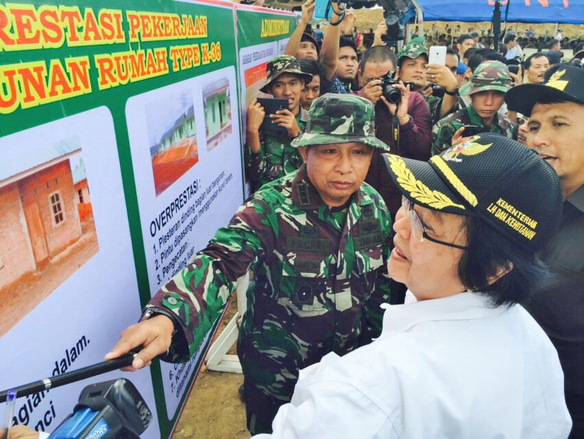 Foto 2 : Menteri Lingkungan Hidup dan Kehutanan Siti Nurbaya mendengarkan penjelasan progres pembangunan tahap pertama rumah bagi tempat tinggal pengungsi korban erupsi Gunung Sinabung. Tempat relokasi berada di Desa Siosar, Karo, Sumut.