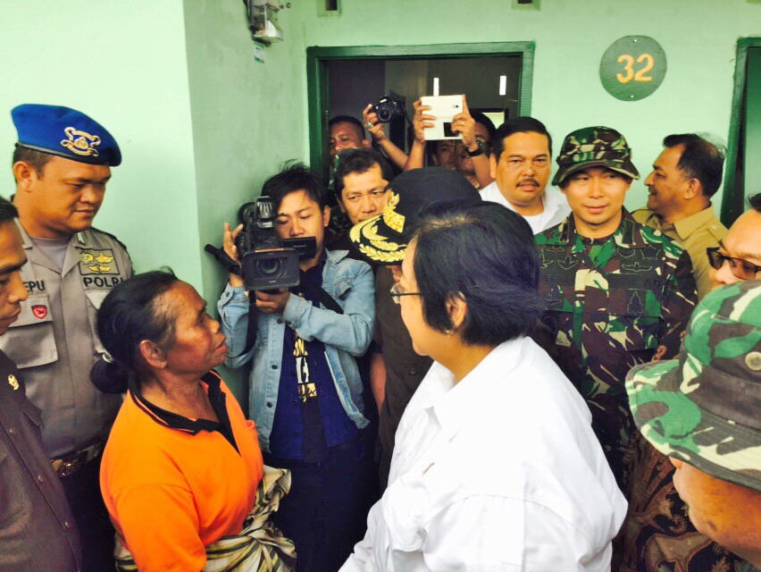 Foto 3 : Menteri Lingkungan Hidup dan Kehutanan mendatangi dan menyapa salah satu pengungsi korban erupsi Gunung Sinabung yang menempati rumah bantuan dari pemerintah dan sudah ditinggali.