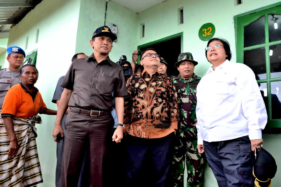 Foto 4 : (kanan-kiri) Menteri Lingkungan Hidup dan Kehutanan Siti Nurbaya, Ketua Komisi VIII DPR RI Saleh Partaonan Daulay dan Gubernur Sumut Gatot Pujo Nugroho meninjau unit rumah yang telah siap ditinggali bagi pengungsi korban erupsi Gunung Sinabung.
