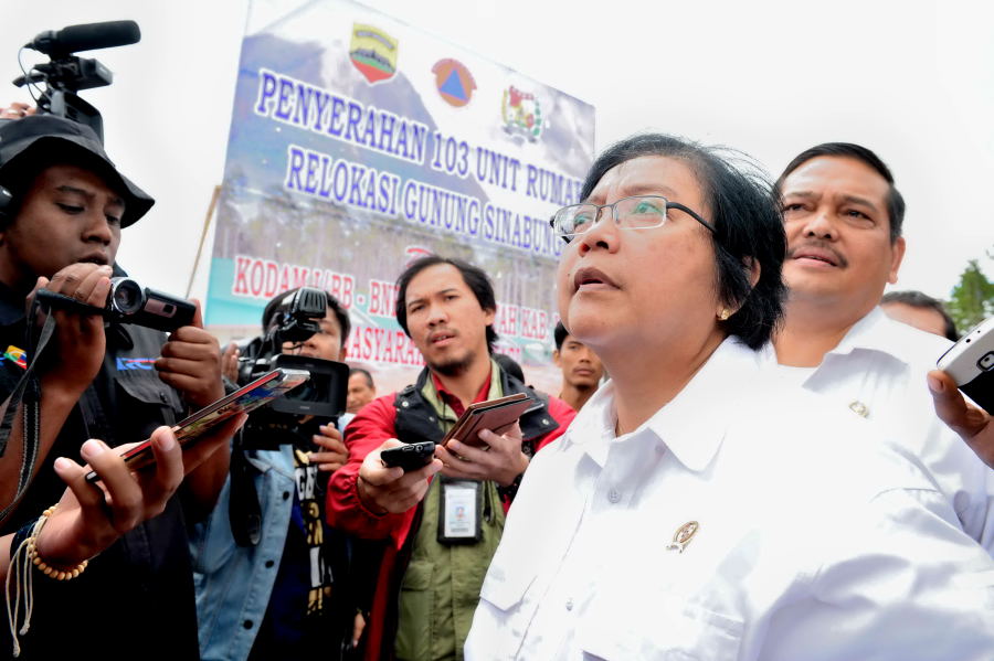 Foto 5 : Menteri Lingkungan Hidup dan Kehutanan Siti Nurbaya memberikan keterangan kepada media usai penyerahan 103 unit rumah bagi pengungsi korban erupsi Gunung Sinabung.