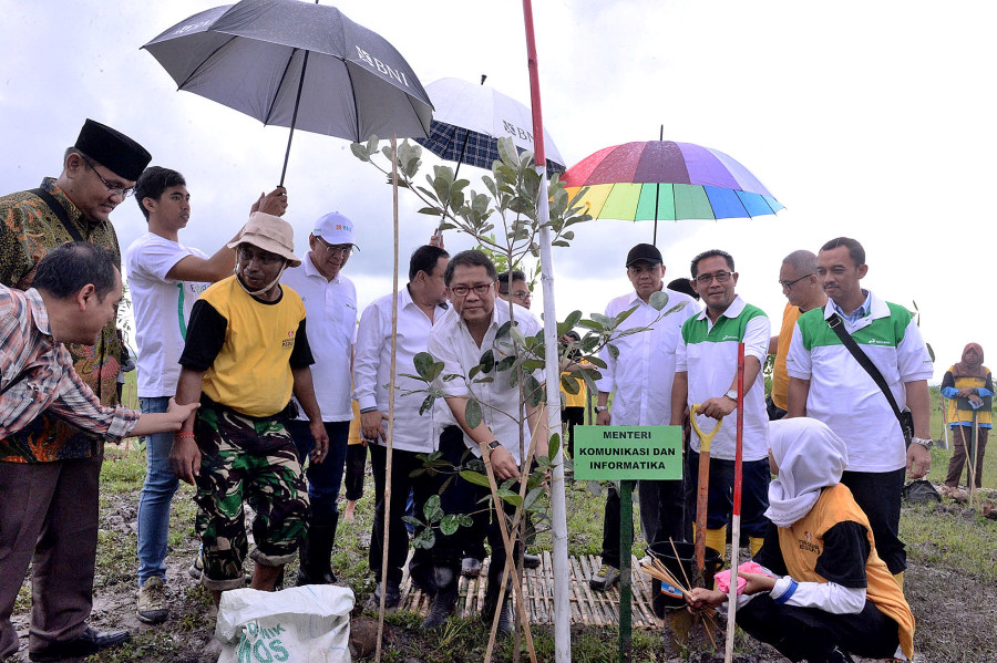 Biro Humas Kementerian LHK, Lombok : Menteri Komunikasi dan Informatika Rudiantara dan Ketua Umum Persatuan Wartawan Indonesia (PWI) Margiono bersama stakeholder seperti BNI Go Green, Pertamina dan Artha Graha Peduli didampingi tuan rumah PT. Angkasa Pura menanam pohon, Senin sore (8/2) di kawasan Bandara Internasional Lombok NTB.  Kegiatan ini merupakan bagian dari agenda Peringatan Hari Pers Nasional (HPN) tahun 2016 yang dilaksanakan di Lombok Nusa Tenggara Barat.