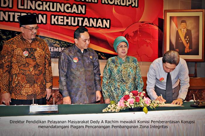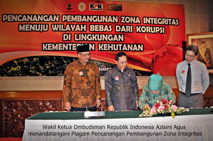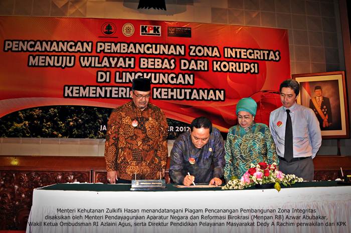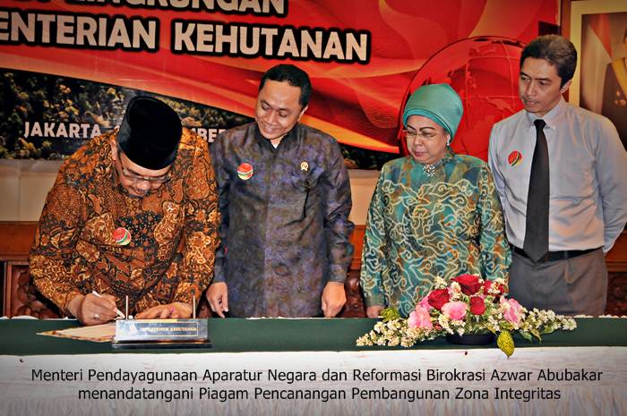 Setelah Mencanangkan Zona Integritas Menteri Kehutanan, Zulkifli Hasan menandatangani pakta integritas bersama Menteri Pendayagunaan Aparatur Negara dan Reformasi Birokrasi Azwar Abubakar, Ombudsman Republik Indonesia yang diwakili oleh Wakil Ketua Azlaini Agus dan Komisi Pemberantasan Korupsi yang diwakili oleh Direktur Pendidikan Pelayanan Masyarakat Dedy A Rachim.