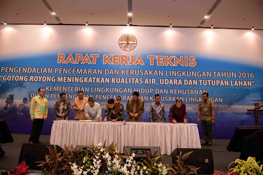 Biro Humas Kementerian LHK, Jakarta : Sekjen KLHK Bambang Hendroyono mewakili Menteri Lingkungan Hidup dan Kehutanan, Siti Nurbaya membuka Rapat Kerja Teknis (Rakernis) Bidang Pengendalian Pencemaran dan Kerusakan Lingkungan, Senin (21/3) di Hotel Bidakara Jakarta. Tujuan Rakernis ini adalah untuk menjalin kesepakatan dengan semua pihak dalam melaksanakan kegiatan pengendalian pencemaran dan kerusakan lingkungan sehingga target yang telah ditetapkan untuk meningkatkan Indeks Kualitas Lingkungan Hidup (IKLH) dapat tercapai sebesar 64,5 - 65,00 pada tahun 2016 dan 66,5 - 68,5 pada tahun 2019. Rakernis dihadiri peserta yang berasal dari BLH Provinsi, Kabupaten/Kota seluruh Indonesia, Kementerian/Lembaga, akademisi, serta para pelaku usaha.