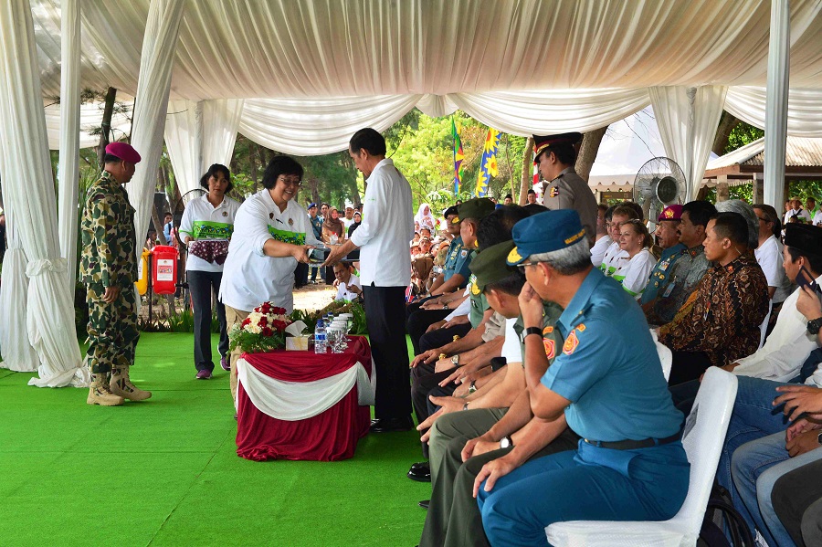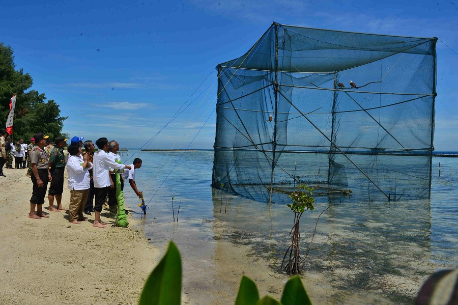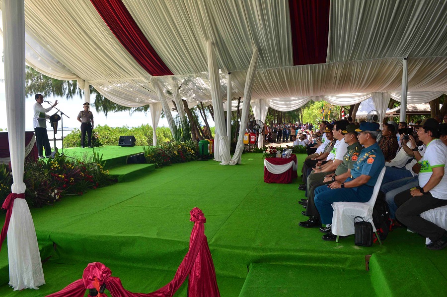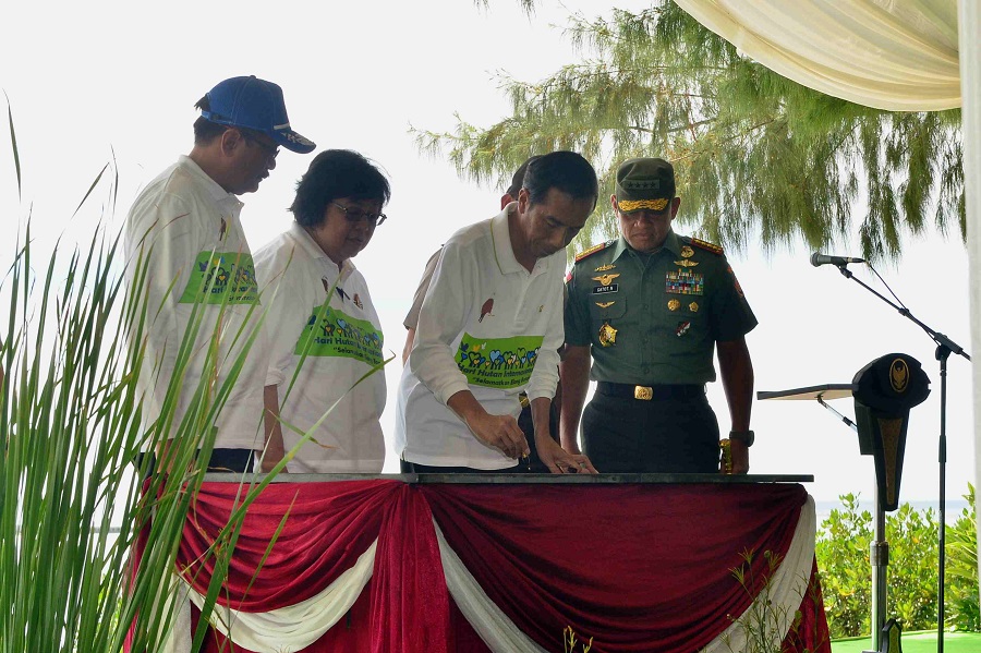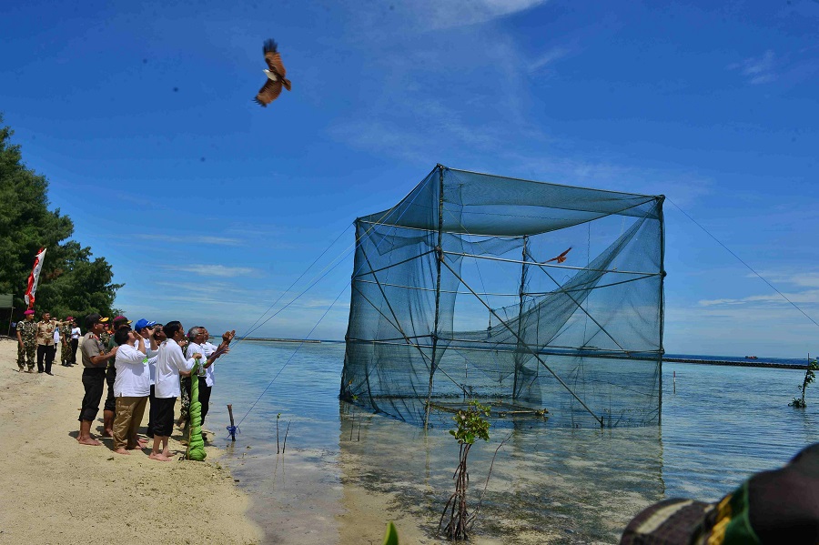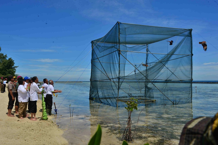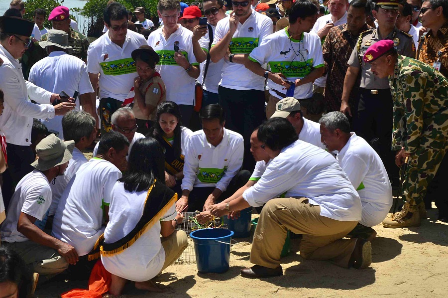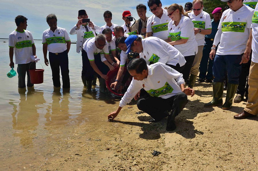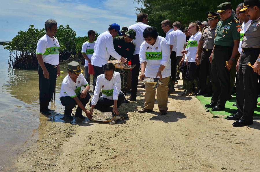Biro Humas KemenLHK, Kepulauan Seribu : Presiden Republik Indonesia Joko Widodo yang didampingi Menteri Lingkungan Hidup dan Kehutanan Siti Nurbaya, Wakil Gubernur DKI Jakarta Djarot Saiful Hidayat, 8 duta besar negara sahabat, 17 mitra kerja internasional serta undangan lainnya mengawali Gerakan Nasional Penyelamatan Tumbuhan dan Satwa Liar dengan melepasliarkan 4 (empat) ekor penyu sisik dewasa dan 200 ekor tukik penyu sisik, serta 3 (tiga) ekor burung elang bondol yang merupakan lambang Pemerintah DKI Jakarta dan 250 ekor burung jenis lain yang merupakan habitat Kepulauan Seribu, Kamis (14/4) di Pulau Karya Kabupaten Administrasi Kepulauan Seribu DKI Jakarta.