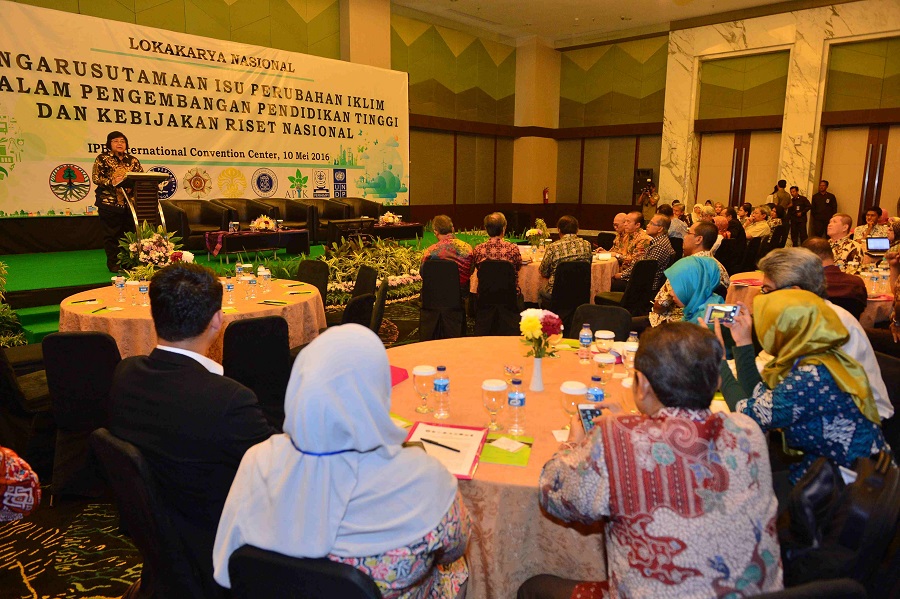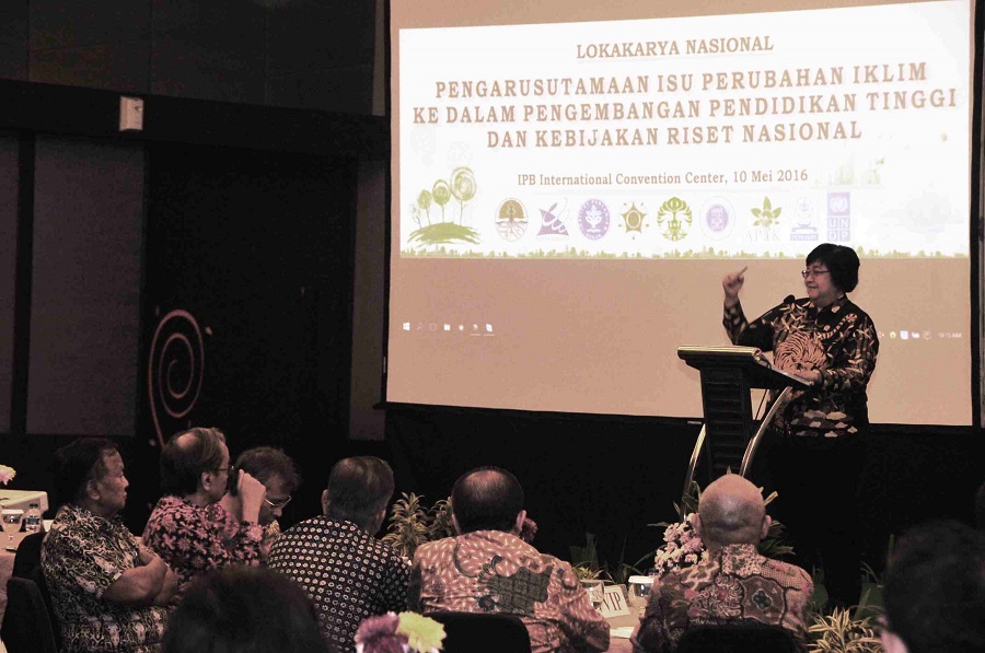 Biro Humas KemenLHK, Bogor : Menteri Lingkungan Hidup dan Kehutanan Siti Nurbaya menyampaikan keynote speech pada Lokakarya Nasional Pengarusutamaan Isu perubahan Iklim ke dalam Pengembangan Pendidikan Tinggi dan Kebijakan Riset Nasional yang diselenggarakan oleh Kemenristek Dikti bersama IPB, UI, ITB dan UGM bekerjasama dengan Kementerian LHK dan UNDP serta APIK (Asosiasi Ahli Perubahan Iklim dan Kehutanan Indonesia), Selasa (10/5) di IPB International Convention Center, Bogor. Pada kesempatan tersebut Siti Nurbaya menyatakan apresiasinya kepada Kementerian Riset dan Dikti bersama Perguruan Tinggi di Indonesia untuk melakukan dan menerapkan hasil riset terkait adaptasi dan mitigasi perubahan iklim yang dapat memberikan kontribusi nyata di masyarakat.