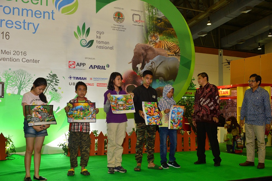 Foto 9 : Kepala Biro Humas KLHK, Novrizal Tahar memberikan hadiah kepada pemenang lomba menggambar pada pameran Indogreen Environment & Forestry Expo 2016.