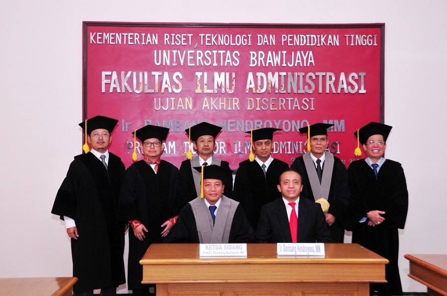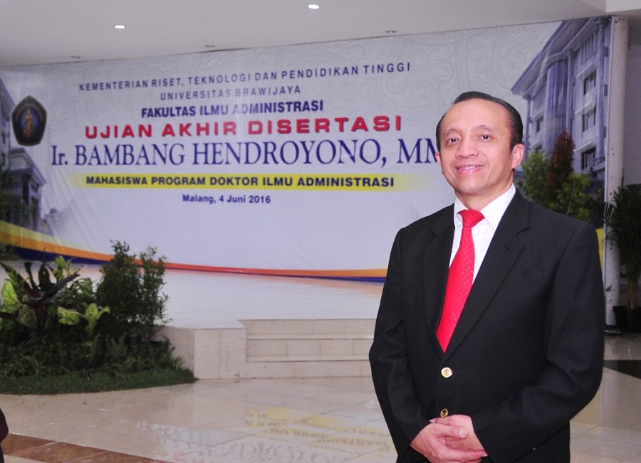 Biro Humas KemenLHK, Malang : Sekretaris Jenderal Kementerian Lingkungan Hidup dan Kehutanan, Ir. Bambang Hendroyono, MM meraih gelar doktor Ilmu Administrasi dari Universitas Brawijaya Malang , Sabtu (04/06) di kampus Pasca Sarjana Unibraw Malang. Gelar doktoral tersebut diraih usai menjalani Sidang Ujian Akhir Disertasi dengan judul