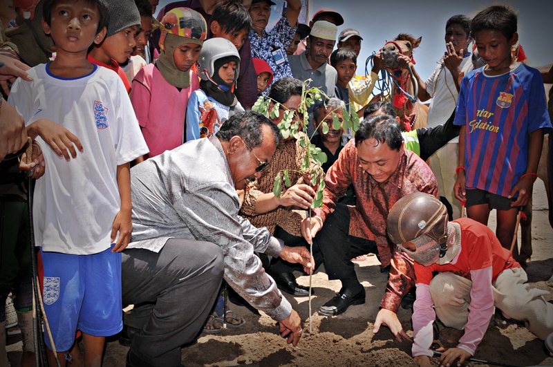 Diakhir kunjungannya Menhut, didampingi Bupati Sumbawa, Jamaludin Malik melakukan penanaman pohon bersama joki-joki cilik di arena Pacuan Kuda Angin Laut, Desa Penyareh, Kabupaten Sumbawa, NTB, sekaligus memberikan motivasi kepada 15 joki cilik dengan menyerahkan bantuan masing-masing Rp.1 juta. ((FOTO PUSHUMAS/ Win/imh/Arset/12)