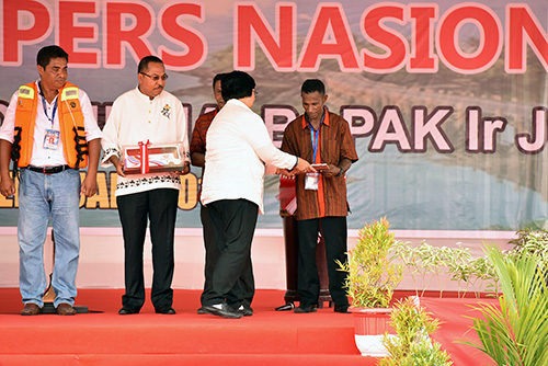 Biro Humas Kementerian Lingkungan Hidup dan Kehutanan, Ambon, Kamis, 9 Februari 2017: Menteri Lingkungan Hidup dan Kehutanan (LHK), Siti Nurbaya menyerahkan Surat Keputusan (SK) Menteri LHK tentang Penetapan Ijin Usaha Pengelolaan Hutan Kemasyarakatan (IUPHKm) dan Hak Pengelolaan Hutan Desa (HPHD) pada saat Puncak Peringatan Hari Pers Nasional 2017 yang diadakan di Kota Ambon, Maluku, Kamis (9/2/2017). SK IUPHKm diserahkan kepada Kelompok Tani Sinar Pemuda pada kawasan hutan produksi terbatas Desa Waru, Kecamatan Teluk Waru, Kabupaten Seram Bagian Timur, Provinsi Maluku seluas