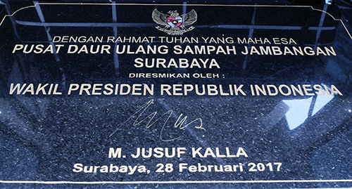 Penandatanganan prasasti oleh Wakil Presiden RI sebagai tanda peresmian Pusat Daur Ulang Sampah di Surabaya dan Lamongan didampingi oleh Menteri Lingkungan Hidup dan Kehutanan, Gubernur Jawa Timur, Walikota Surabaya dan Bupati Lamongan.