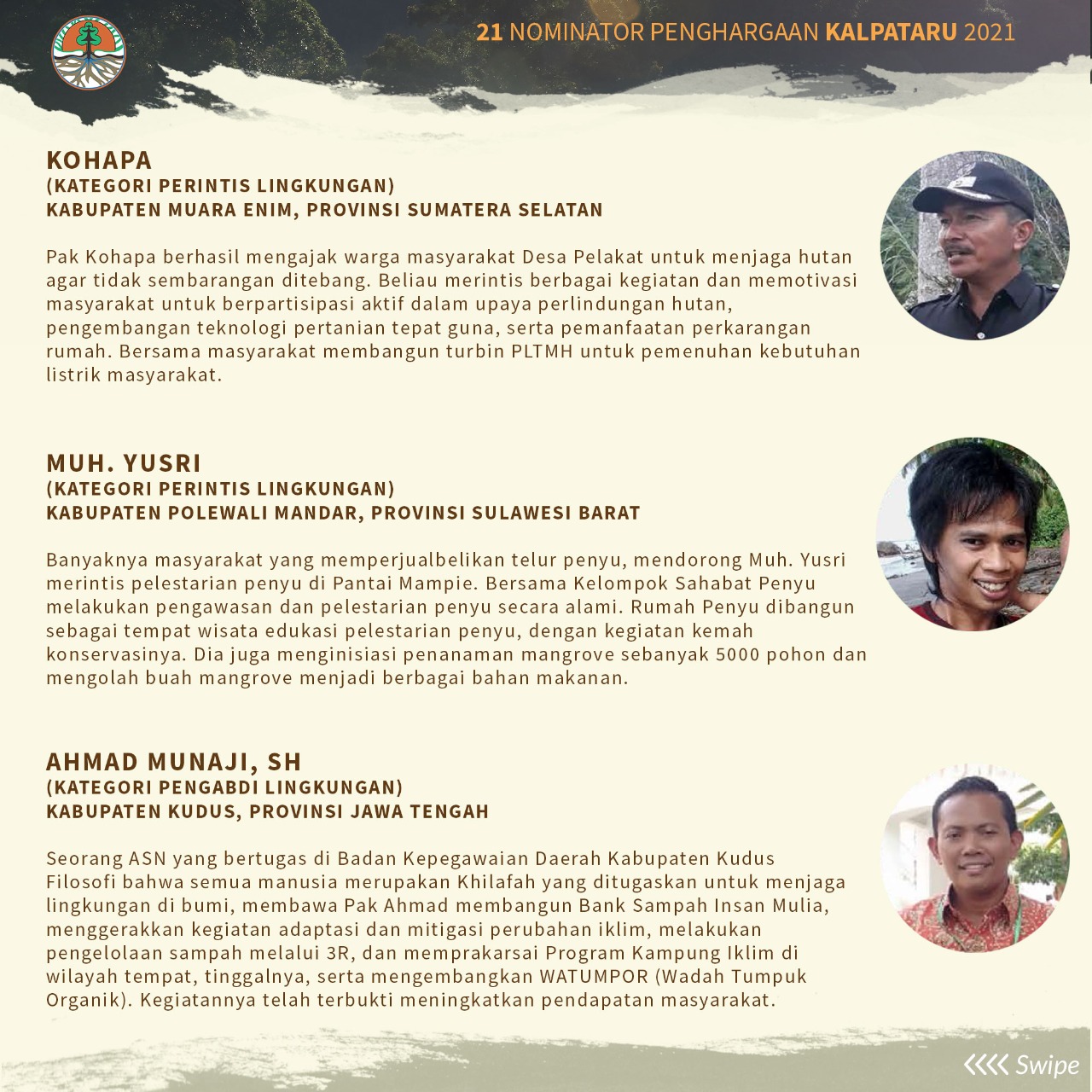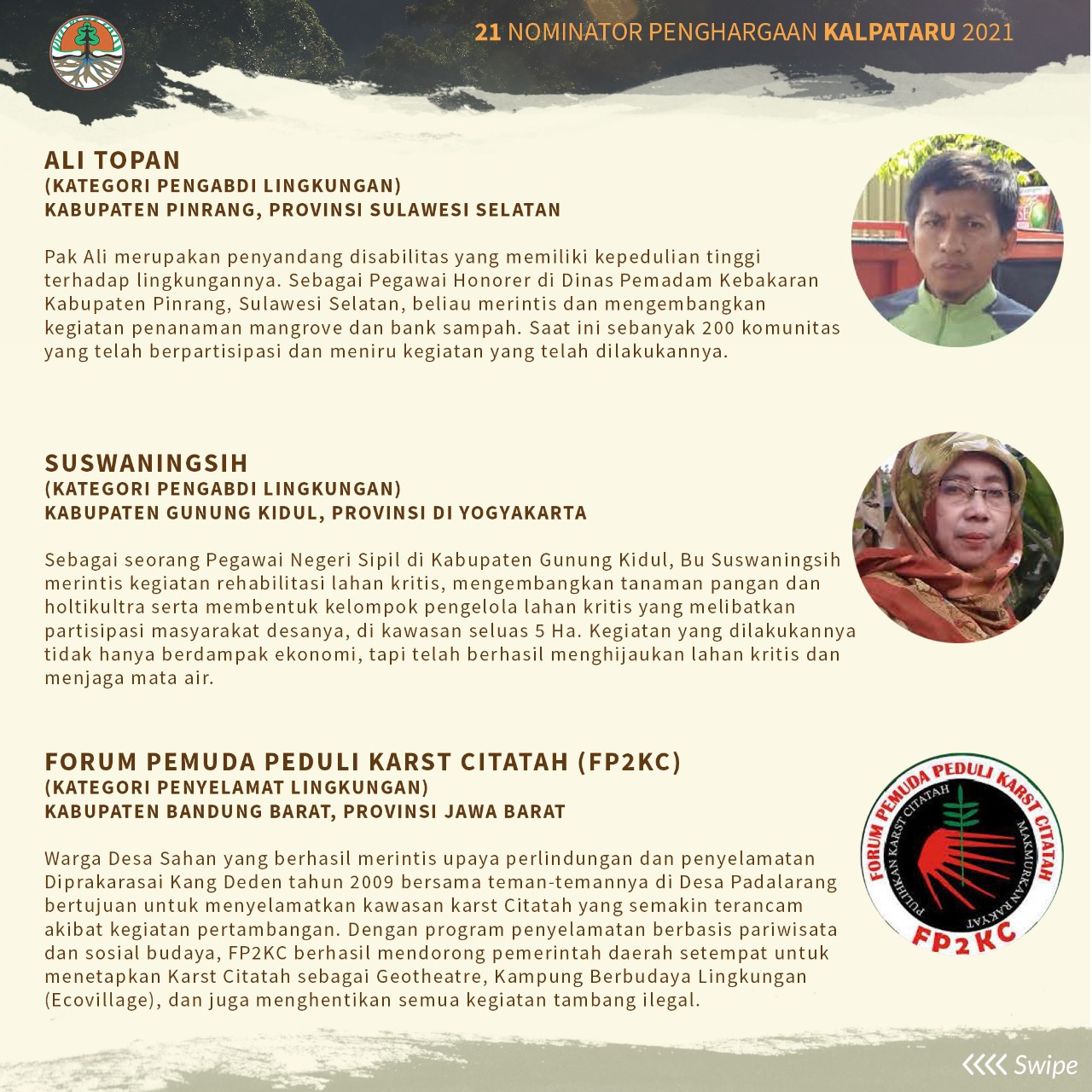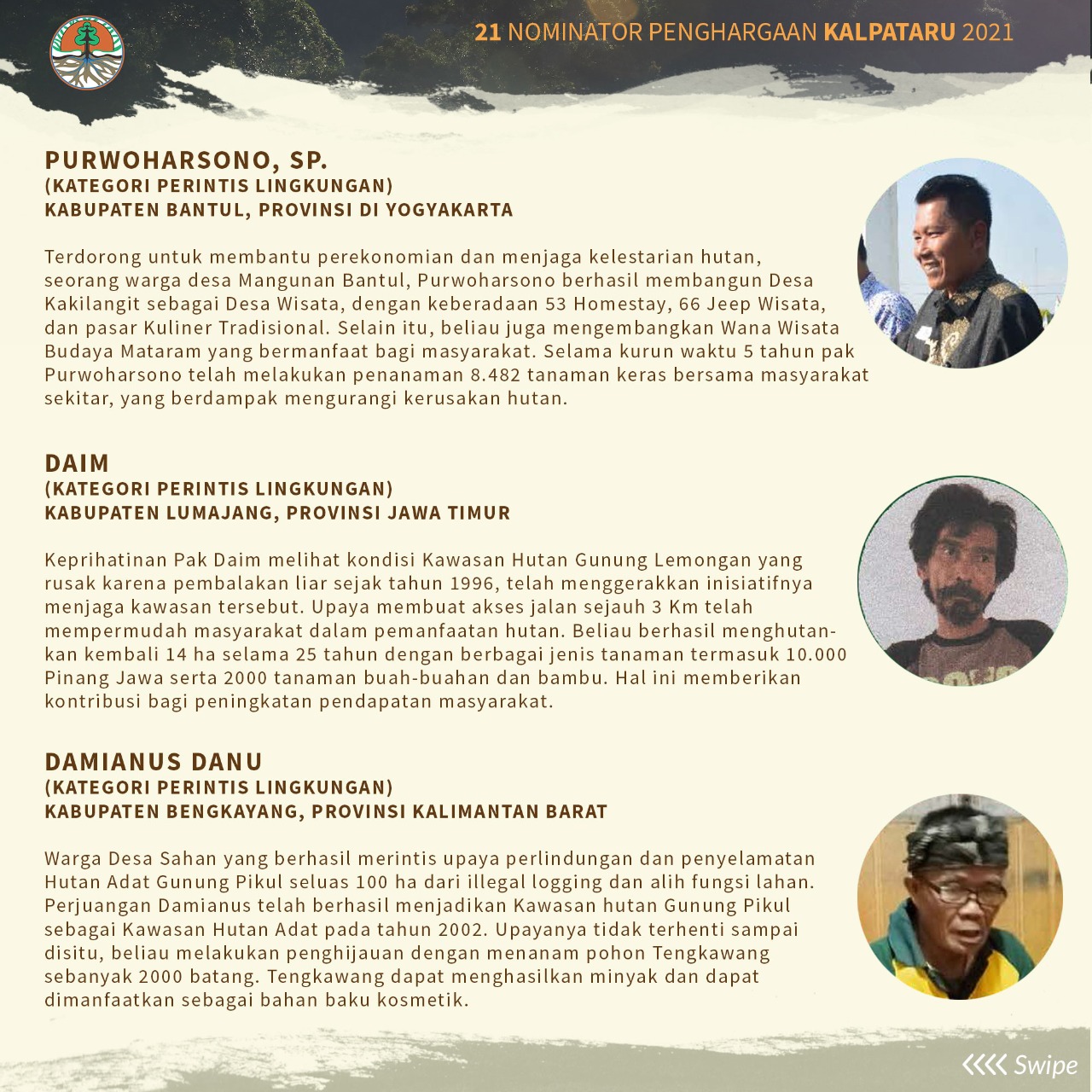 Sesuai dengan Peraturan Menteri Lingkungan Hidup dan Kehutanan Nomor 30 tahun 2017 tentang Penghargaan Kalpataru, Pasal 16, Ayat 2 bahwa Kementerian Lingkungan Hidup dan Kehutanan membuka kesempatan kepada publik untuk memberikan tanggapan maupun saran terhadap 21 nomine ini selama 7 hari sejak informasi ini dipublikasikan.