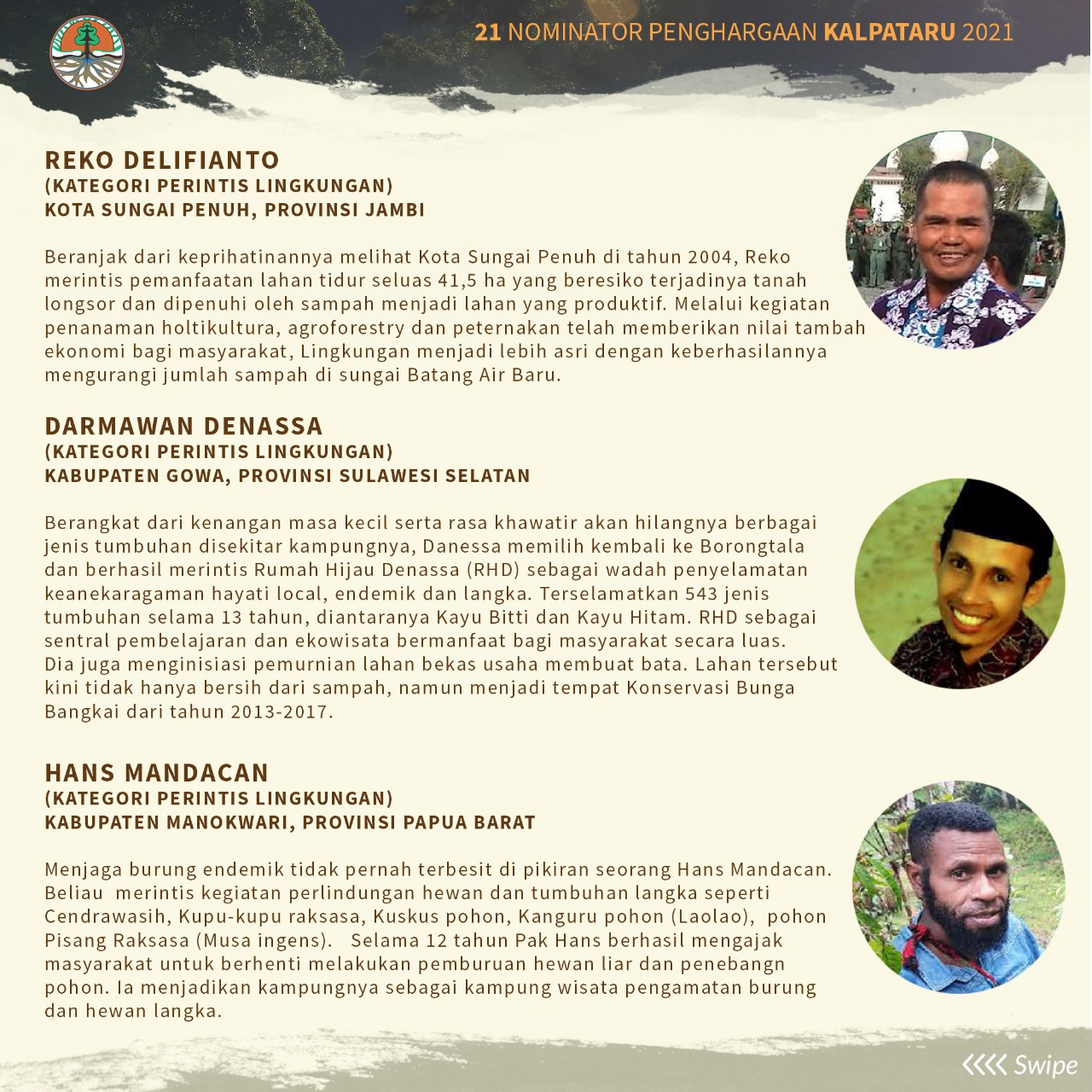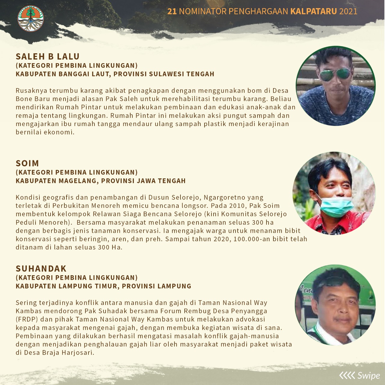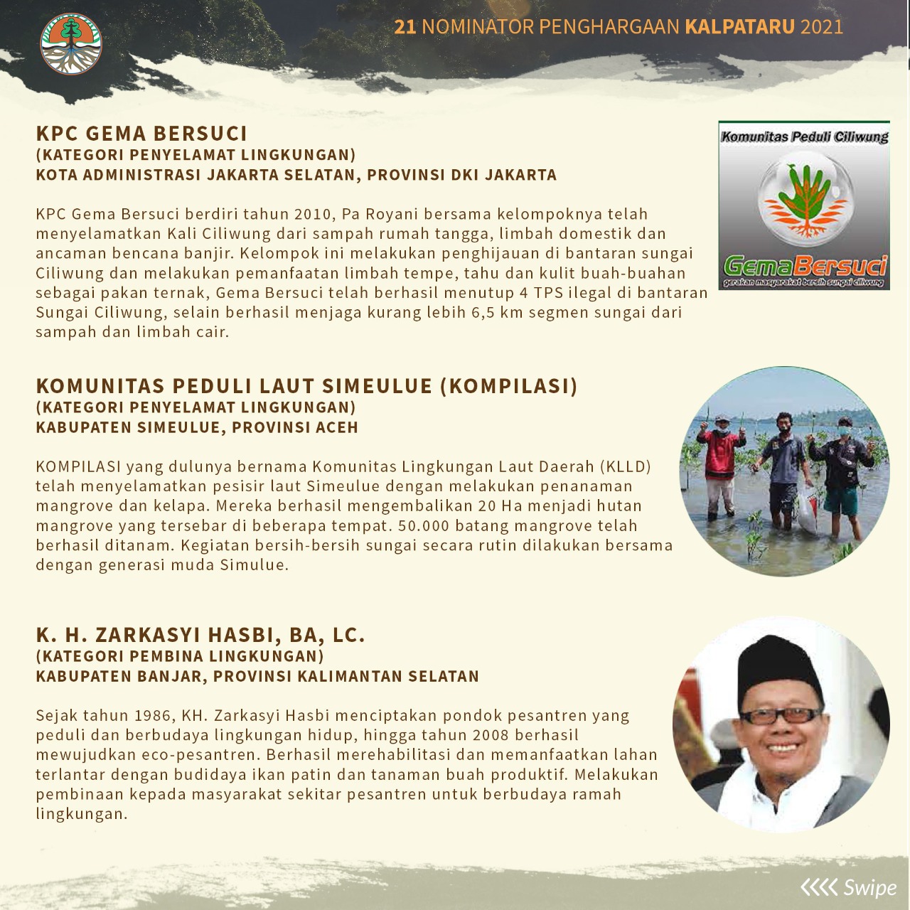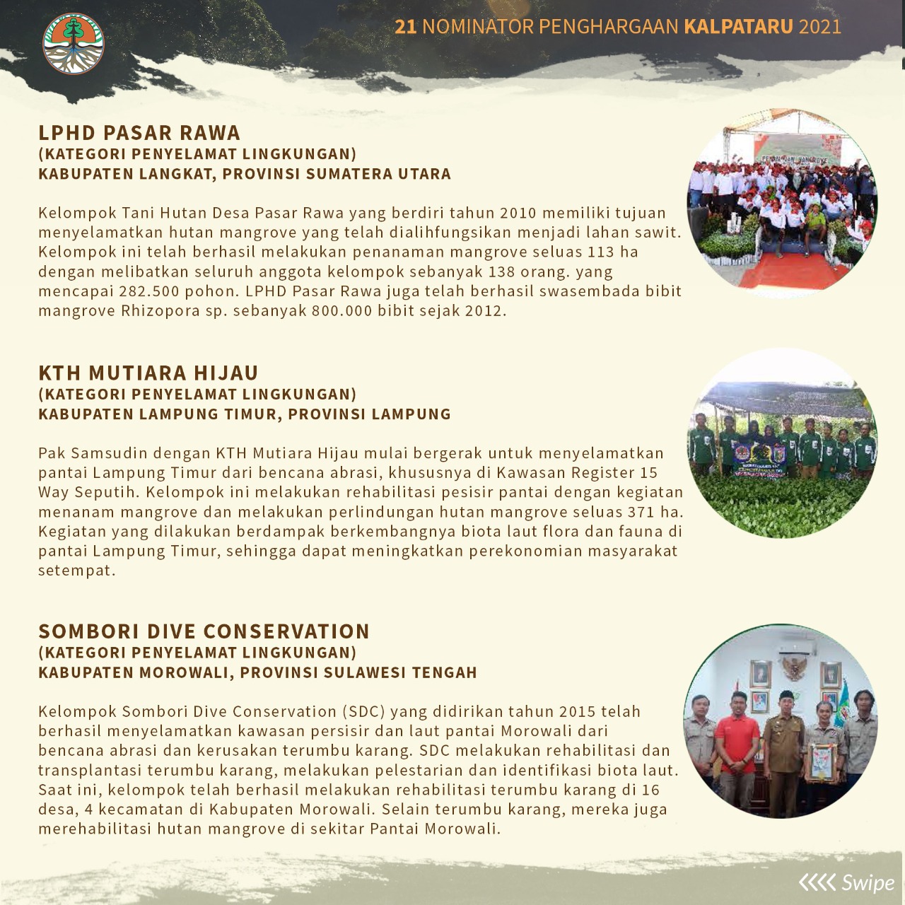 21 Nominasi Penerima Penghargaan Kalpataru dipilih melaui Sidang Dewan Pertimbangan Penghargaan Kalpataru, yang terdiri dari : 8 nomine Perintis Lingkungan, 3 nomine Pengabdi Lingkungan, 6 nomine Penyelamat Lingkungan dan 4 nomine Pembina Lingkungan.