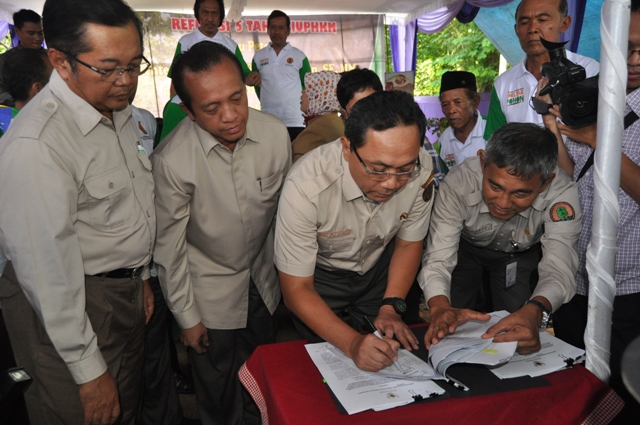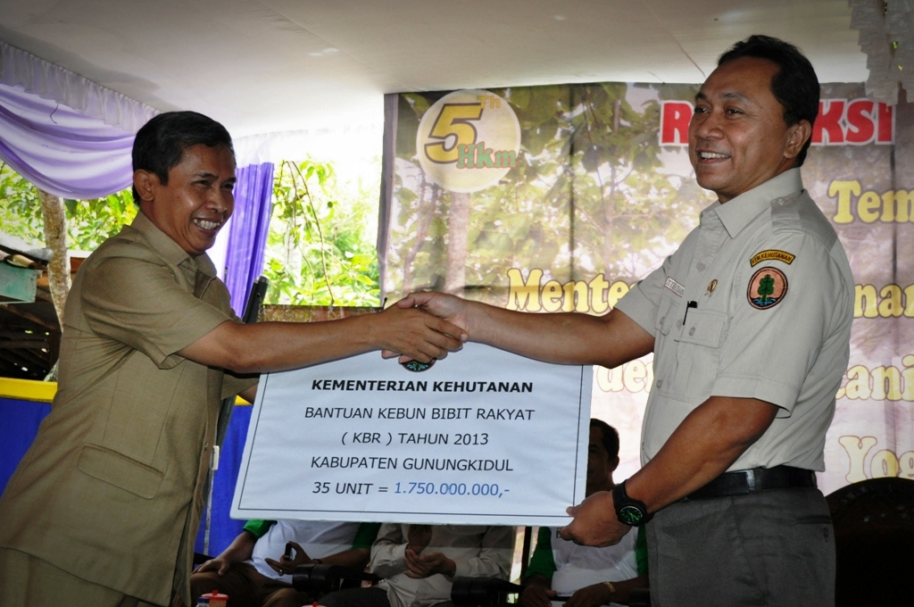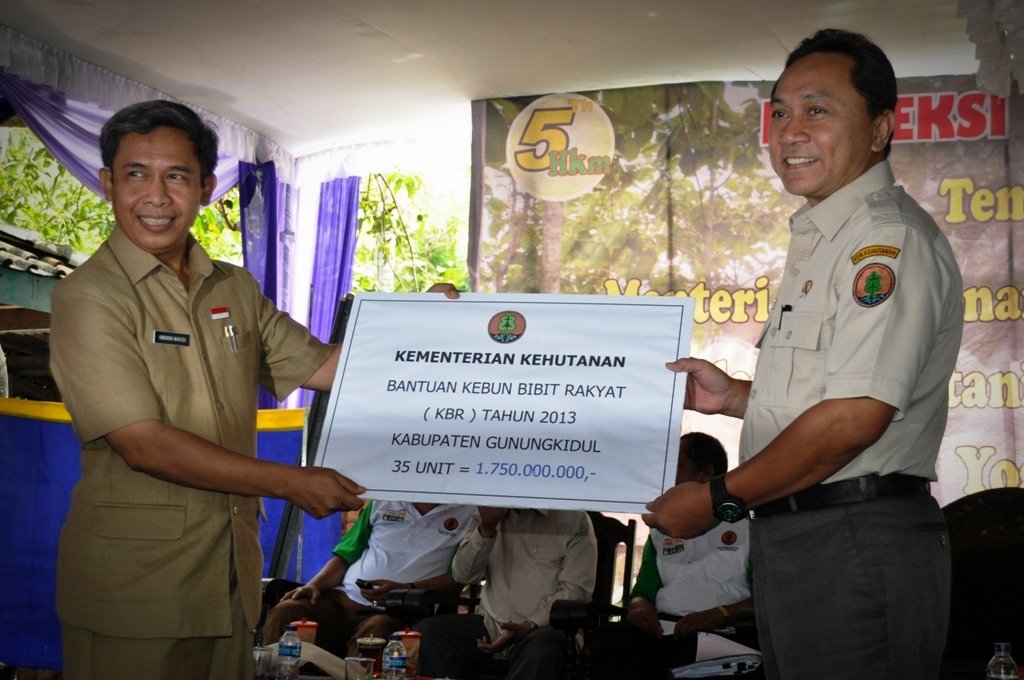 Pada kesempatan kunjungan kerjanya Menhut juga menandatangani Izin Usaha Pemanfaatan Hasil Hutan Kayu dalam Hutan Kemasyarakatan (IUPHHK-HKm) untuk 35 kelompok tani hutan di Karangasem, Paliyan, Kab. Gunung Kidul. Disamping itu Menhut Zulkifli Hasan juga memberikan bantuan Kebun Bibit Rakyat (KBR) kepada 35 kelompok tani hutan di Gunung Kidul yang diterima secara simbolis oleh Wakil Bupati Gunung Kidul, Immawan Wahyudi, di Karangasem, Gunung Kidul, Yogyakarta(Foto Pushumas/toy/rd/12)
