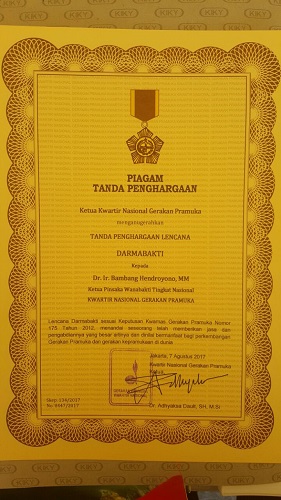Sekretaris Jenderal Kementerian LHK Menerima Lencana Darmabakti dari Ketua Kwartir Nasional Gerakan