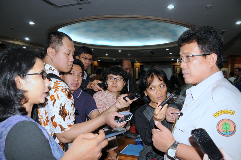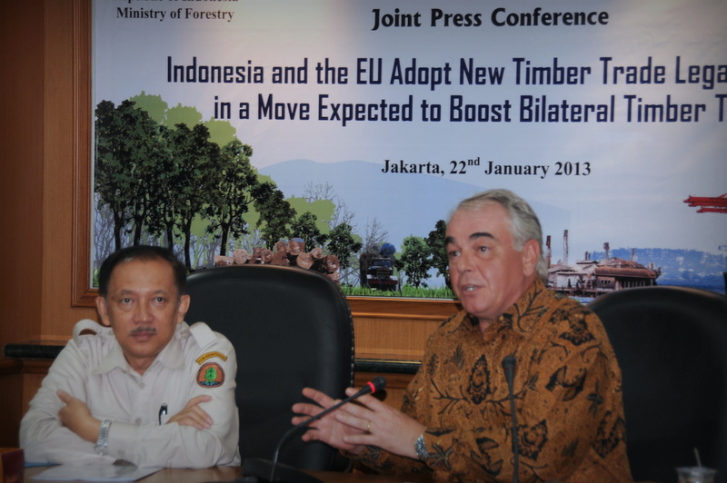 Inti dari jumpa pers tersebut adalah bahwa kedua belah pihak menyatakan kesamaan tekad untuk memerangi perdagangan kayu ilegal dengan adanya SVLK, hanya kayu yang memiliki Dokumen V-Legal yang bisa masuk ke Uni Eropa. (Berita selengkapnya http://ppid.dephut.go.id/berita_terkini/browse/7) (FOTOPUSHUMAS/daus/arset/13)