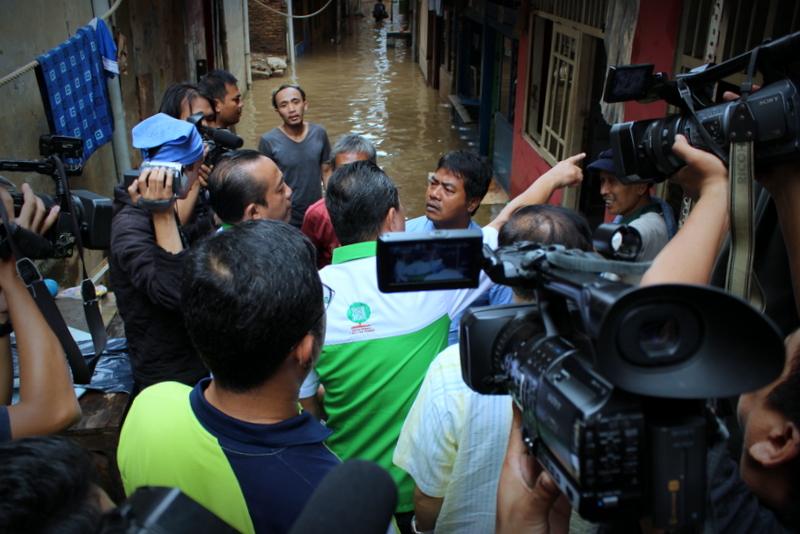 Pushumas Kemenhut, Jakarta: Menteri Kehutanan Zulkifli Hasan, mengunjungi warga korban banjirdi Kampung Pulo RT 03 RW 03, Jatinegara Barat, Kampung Melayu, Jakarta Timur, Kamis (24/1). Dalam kunjungannya Menhut didampingi Sekjen Kemenhut Hadi Daryanto, Dirjen Badan Usaha Kehutanan (BUK) Bambang Hendroyono dan Direktur Jenderal Bina Pengelolaan Daerah Aliran Sungai dan Perhutanan Sosial (BPDASPS) Hilman Nugroho, serta pejabat Kemenhut lainnya.