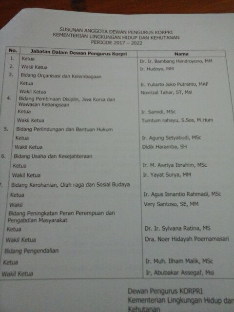 Jakarta, Kementerian Lingkungan Hidup dan Kehutanan, 28 Agustus 2017. Menteri Lingkungan Hidup dan Kehutanan, Siti Nurbaya, mengukuhkan Dewan Pengurus Korps Pegawai Republik Indonesia (KORPRI) Unit Kementerian Lingkungan Hidup dan Kehutanan Masa Bakti 2017 - 2022. Acara pengukuhan berlangsung di Jakarta, tanggal 28 Agustus 2017.