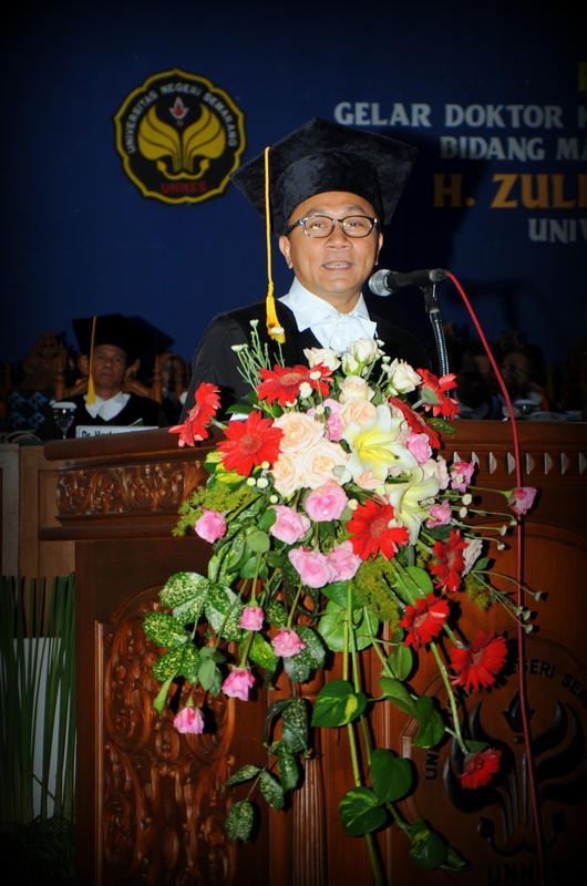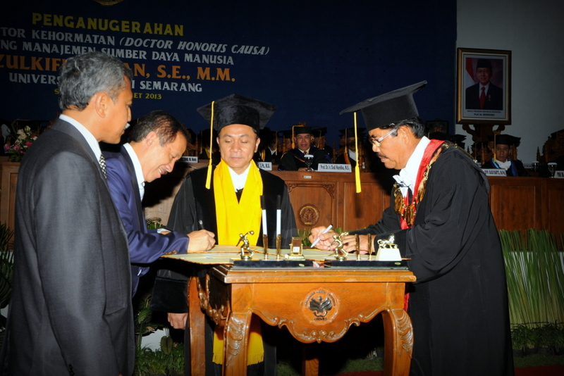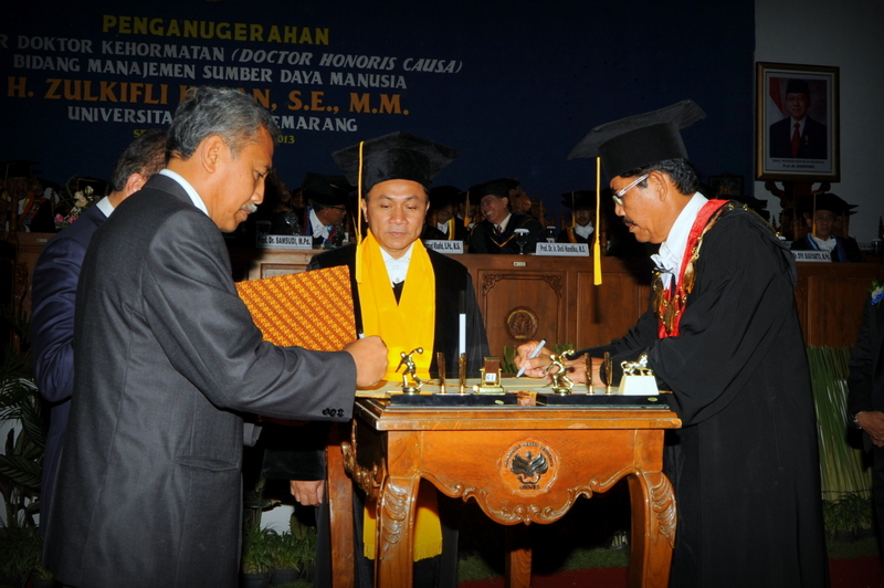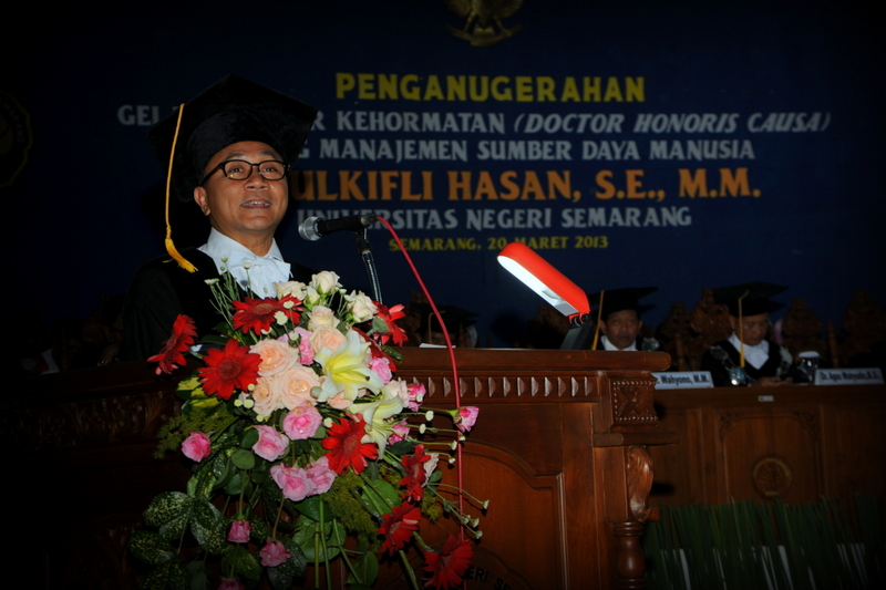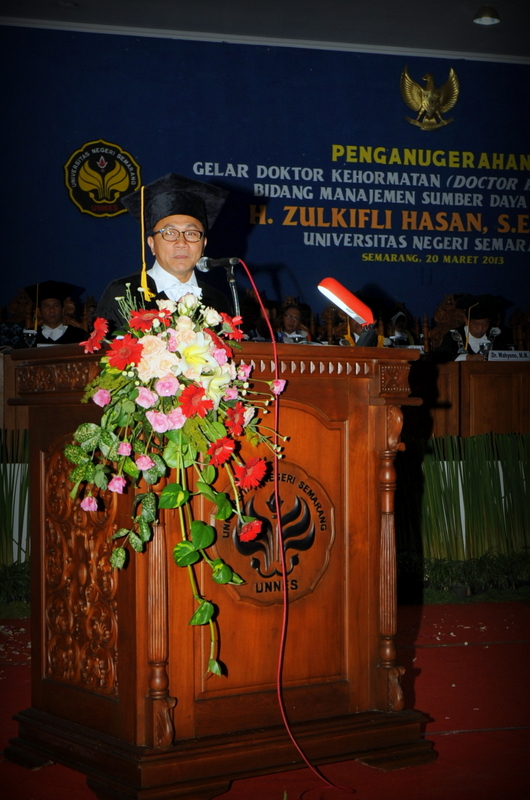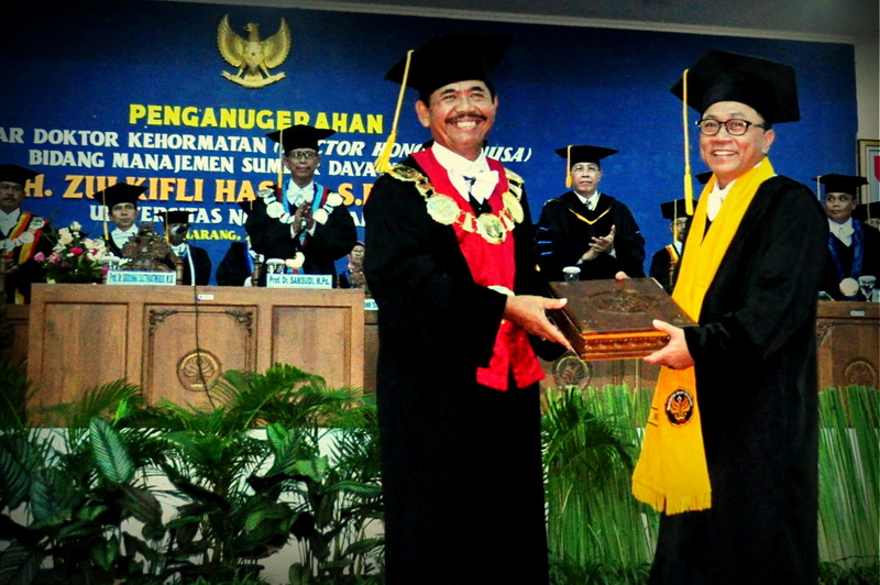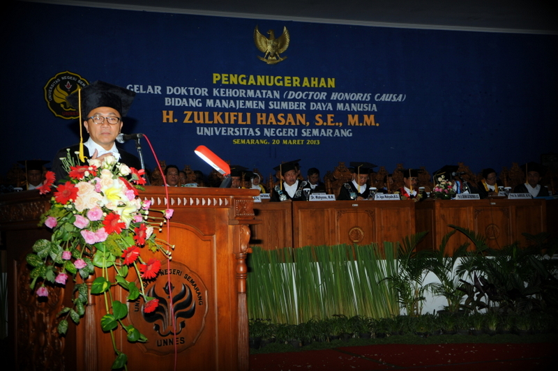 Pemberian gelar Doktor Honoris Causa kepada Menhut Zulkifli Hasan dilakukan oleh Rektor Universitas Negeri Semarang Prof.Dr.Masrukhi,M,Pd disaksikan oleh seluruh anggota senat Universitas Negeri Semarang serta beberapa anggota DPR RI, para pejabat Eselon I dan II Kementerian Kehutanan serta Civitas Academica Universitas Negeri Semarang.