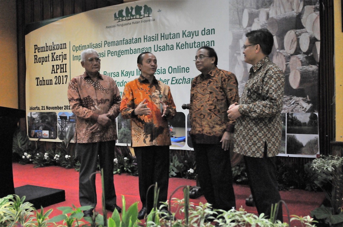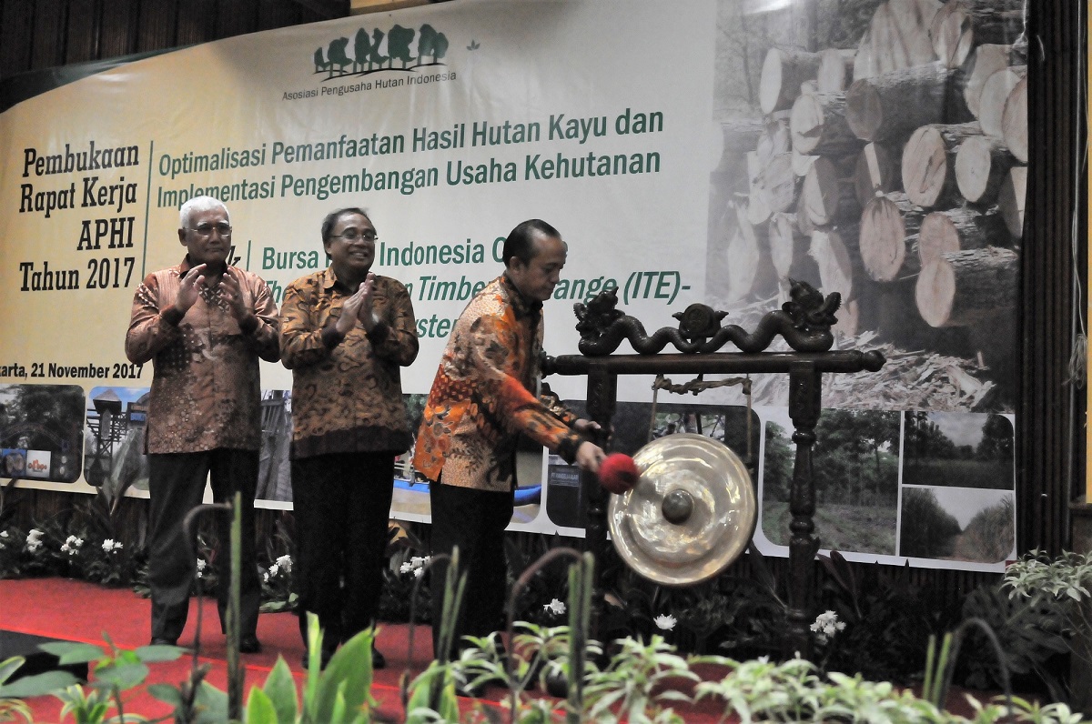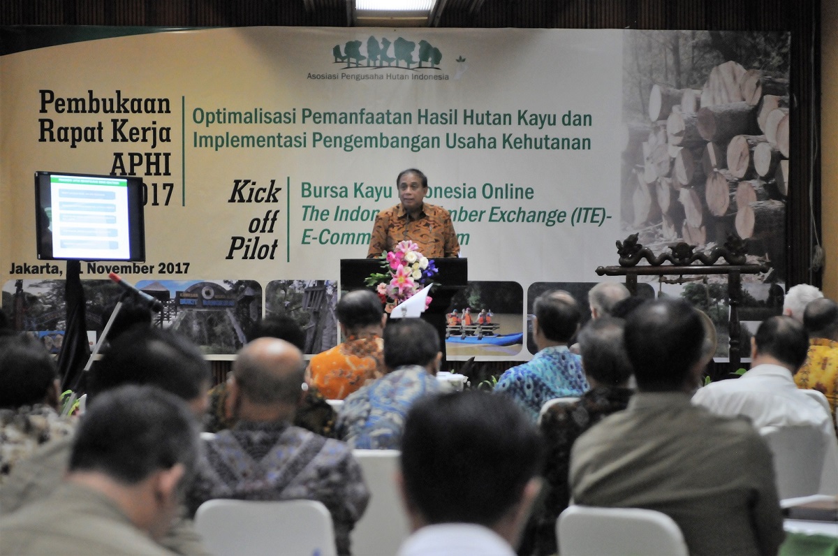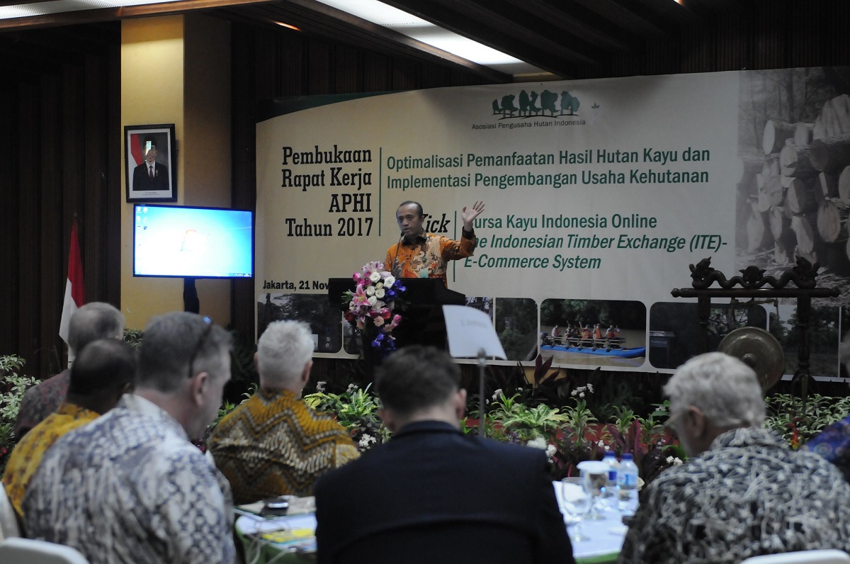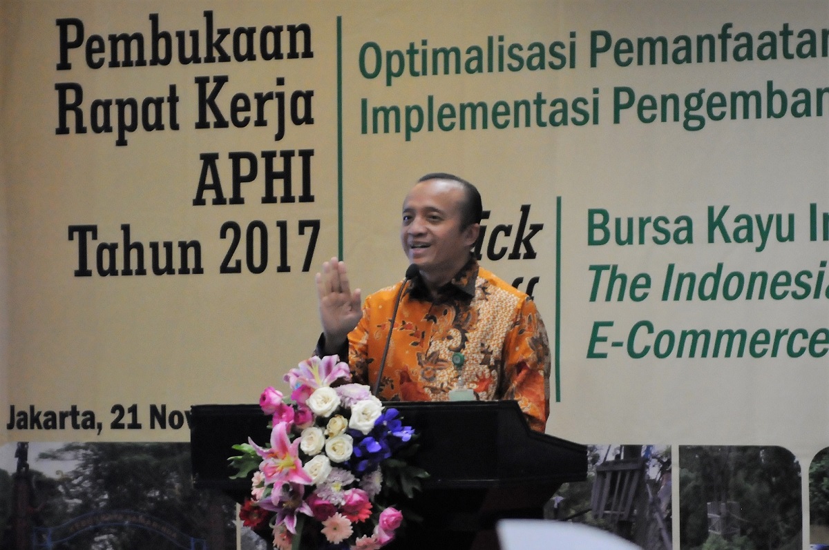 Sekretaris Jenderal Kementerian Lingkungan Hidup dan Kehutanan (KLHK), Bambang Hendroyono, mewakili Menteri LHK, membuka Rapat Kerja Asosiasi Pengusaha Hutan Indonesia (APHI) 2017 di Jakarta (21/11/2017). Dalam sambutannya, Bambang menyampaikan, pentingnya mempertahankan fungsi produksi, fungsi sosial, dan fungsi lingkungan, dalam pengelolaan hutan produksi.