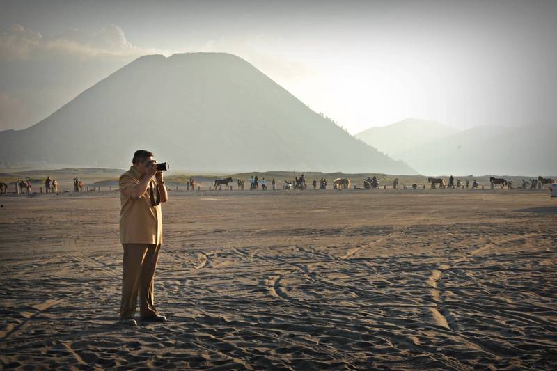 Sebelum meninggalkan lokasi acara, Presiden SBY bersama Ibu Ani menyempatkan menikmati pemandangan di Kaldera Lautan Pasir Taman Nasional Bromo Tengger Semeru dengan mengabadikan dengan kamera foto. (FOTOPUSHUMAS/arset/13)