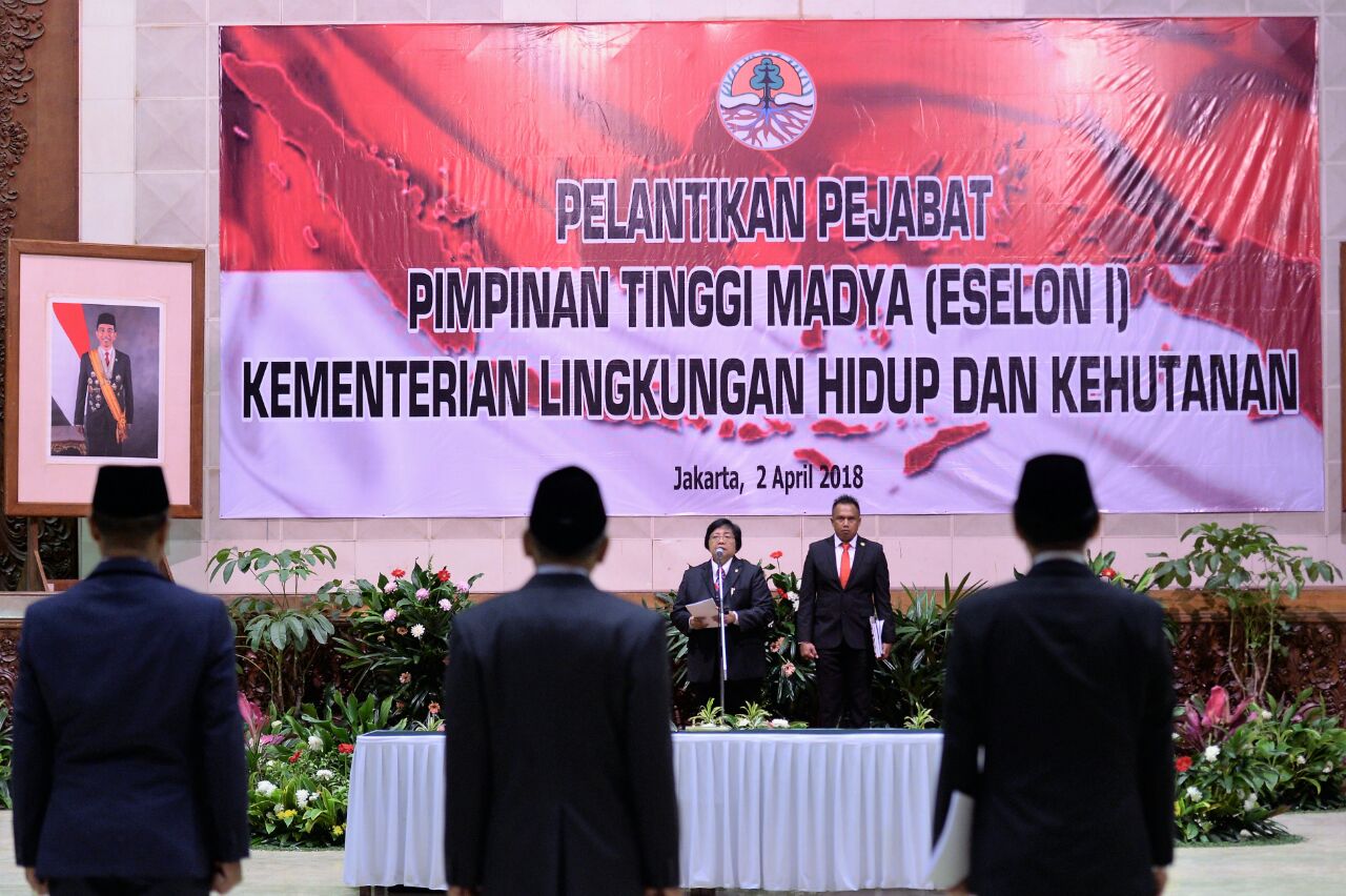 Menteri LHK Siti Nurbaya melantik tiga orang Pejabat Pimpinan Tinggi Madya (Eselon I) baru lingkup Kementerian LHK di Jakarta, Senin, (2/4/2018). Pejabat-pejabat yang dilantik mempunyai posisi penting...