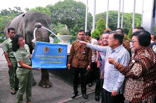Biro Humas KemenLHK,, Jakarta :  Wakil Presiden RI, Jusuf Kalla disambut oleh dua ekor gajah saat hadir untuk membuka ...