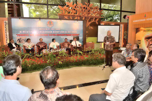 Pushumas KemenLHK, Jakarta : Menteri Lingkungan Hidup dan Kehutanan Siti Nurbaya, memaparkan Refleksi 100 Hari dalam menahkodai Kementerian Lingkungan Hidup dan Kehutanan, Rabu (3/2) di Lobi Utama Ged...