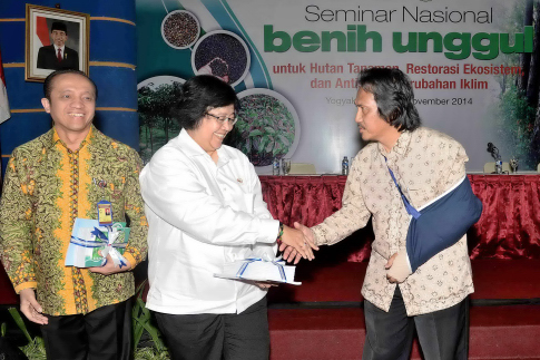 Pushumas Kemenhut, Jogyakarta : Kepala Badan Litbang Kehutanan, San Afri Awang menyerahkan Karya Unggulan dari Litbang Kehutanan berupa buku-buku tentang Budidaya Jenis Pohon Unggulan serta Restorasi ...
