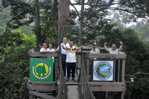 Pushumas Kemenhut, Kutai Kertanegara : Menteri Kehutanan Zulkifli Hasan meniti Canopy Bridge pada ketinggian 30 meter dari permukaan tanah sepanjang 64 meter yang terhubung dengan pohon bangkirai yang...