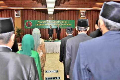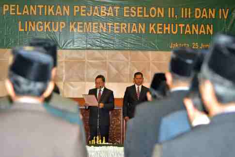Pushumas Kemenhut, Jakarta: Menteri Kehutanan RI Zulkifli Hasan melantik 18 (delapan belas) Pejabat Struktural Eselon II lingkup Kementerian Kehutanan, Jumat (06/6) di Rimbawan I Gedung Kehutanan Mang...