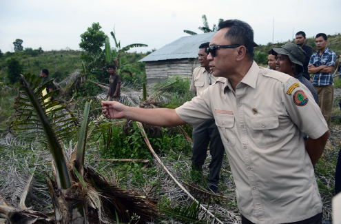 Pushumas Kemenhut, Indragiri Hulu Riau : Menteri Kehutanan RI Zulkifli Hasan meninjau lokasi eks perambahan liar kawasan Taman Nasional Tesso Nilo (TNTN) , Selasa (5/8). di Kawasan Taman Nasional Tess...