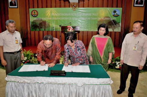 Pushumas Kemenhut, Jakarta : Menteri Kehutanan Zulkifli Hasan menandatangani MoU dengan Erna Witular Koordinator Gerakan Perempuan Tanam dan Pelihara (GPTP) terkait Rehabilitasi Lahan dan Pemberdayaan...