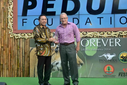 Pushumas Kemenhut, Jakarta : Menteri Kehutanan Zulkifli Hasan menerima Tiger Champion Award dari CEO Panthera Dr. Alan Rabinowitz dalam acara Tiger Conservation Awards, Rabu (16/07) di Hotel Borobudur...