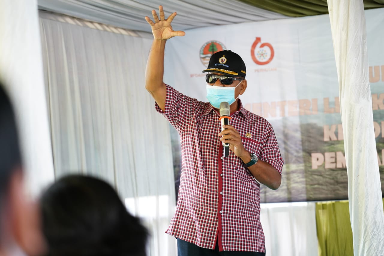 Menteri Lingkungan Hidup dan Kehutanan (LHK), Siti Nurbaya didampingi Sekjen LHK, Bambang Hendroyono, Plt Dirjen Pengelolaan Daerah Aliran Sungai dan Hutan Lindung (DASHL) Hudoyo, dan Kepala Badan P2S...