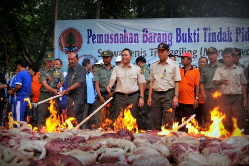 Pushumas Kemenhut, Surabaya : Menteri Kehutanan, Zulkifli Hasan, memusnahkan 228 ekor barang bukti trenggiling (Manis javanica) di halaman kantor Balai Besar Konservasi Sumber Daya Alam (KSDA) Jawa Ti...