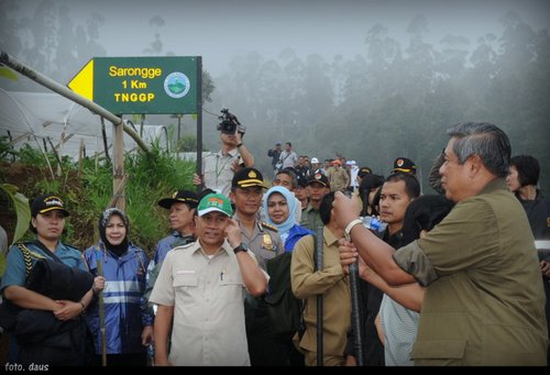 Pushumas Kemenhut, Cianjur : Dengan berjalan kaki kurang lebih sepanjang 2 km, Presiden RI Susilo Bambang Yudhoyono , bersama Ibu Negara Ani Yudhoyono mengunjungi Kampung Sarongge, Desa Ciputri, Kecam...