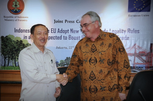 Pushumas Kemenhut, Jakarta : Sekretaris Jenderal Kementerian Kehutanan, Hadi Daryanto, bersama dengan Duta Besar/Kepala Delegasi Uni Eropa untuk Indonesia, Brunei Darussalam dan ASEAN, Julian Wilson, ...