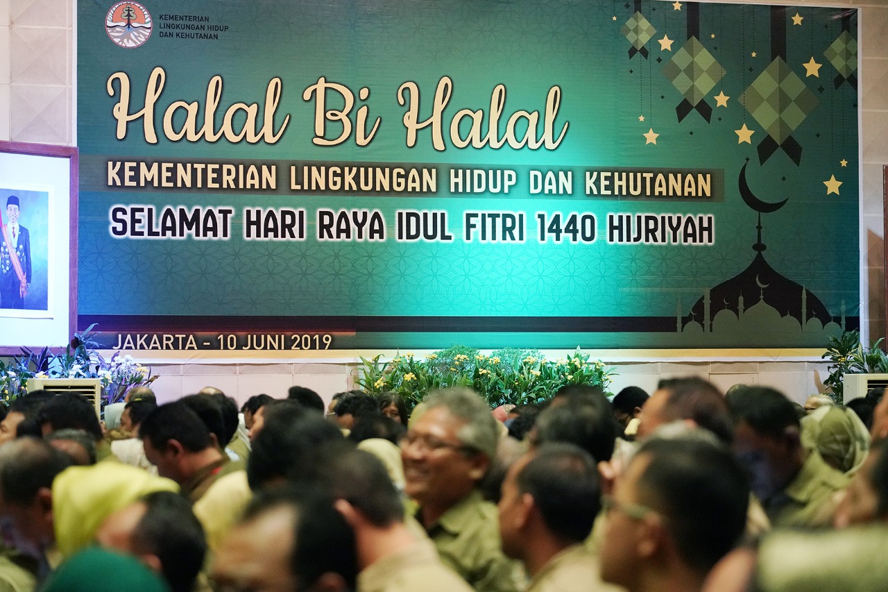 Menteri LHK Siti Nurbaya menggelar acara halal bihalal bersama segenap keluarga besar KLHK, di Auditorium Dr. Soedjarwo Gedung Manggala Wanabakti, Jakarta, (10/6). Menteri Siti didampingi oleh seluruh...