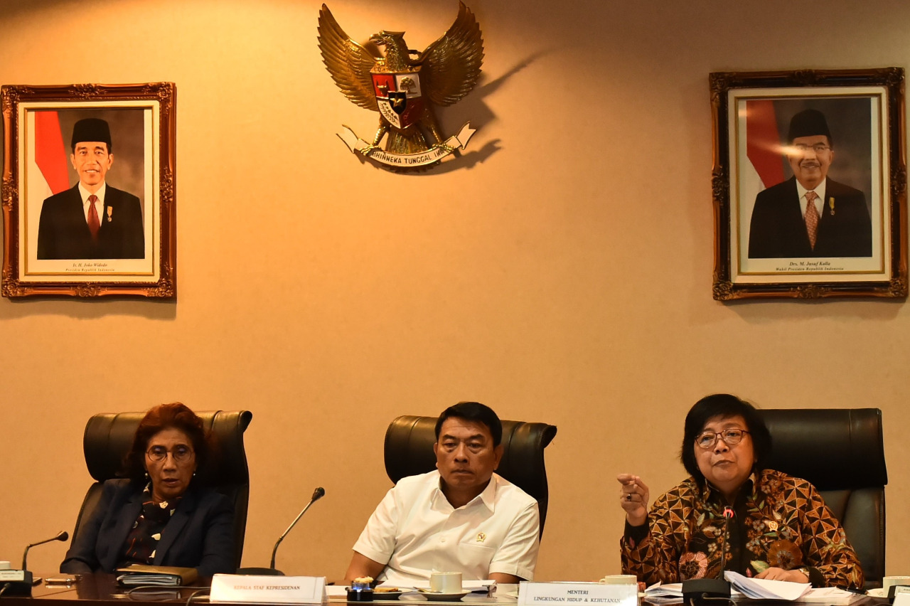 Menteri LHK, Siti Nurbaya bersama dengan Menteri Kelautan dan Perikanan (KKP), Susi Pudjiastuti memaparkan kepada media langkah-langkah korektif yang dilakukan pemerintahan Joko Widodo dan Jusuf Kalla...