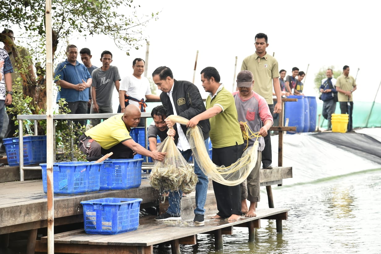 Presiden Joko Widodo melaksanakan panen raya udang Vaname di lokasi Izin Pemanfaatan Hutan Perhutanan Sosial (IPHPS) di Desa Pantai Bakti, Kecamatan Muara Gembong, Kabupaten Bekasi, Jawa Barat (30/1)....